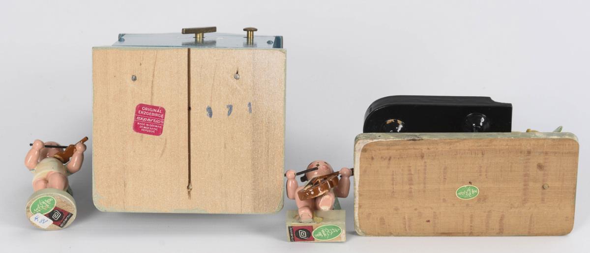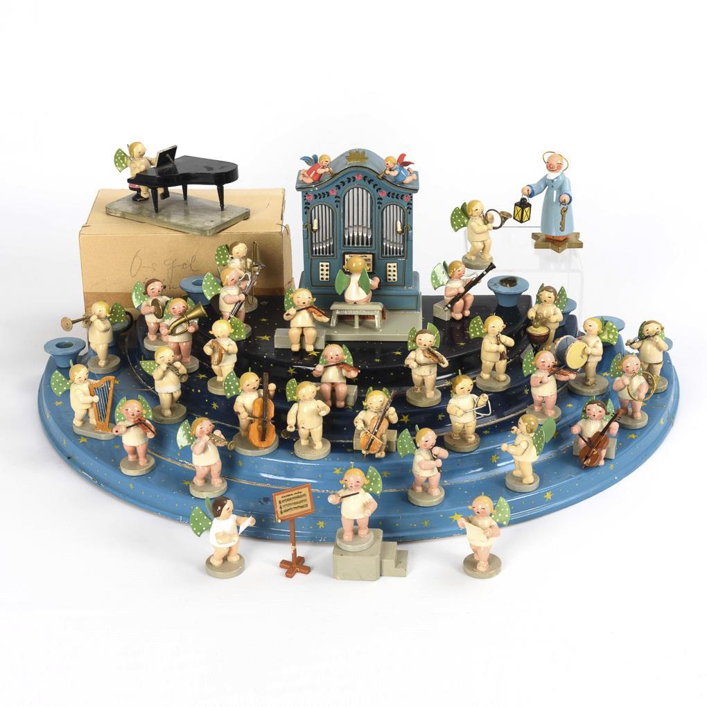 Large semi-circular staircase with candle grommets, organ, wings, Peter figure and about 30 angels playing music. In addition, some replacement candlesticks. Varnish defects on the staircase and partly on the figures. Small defects and repairs.