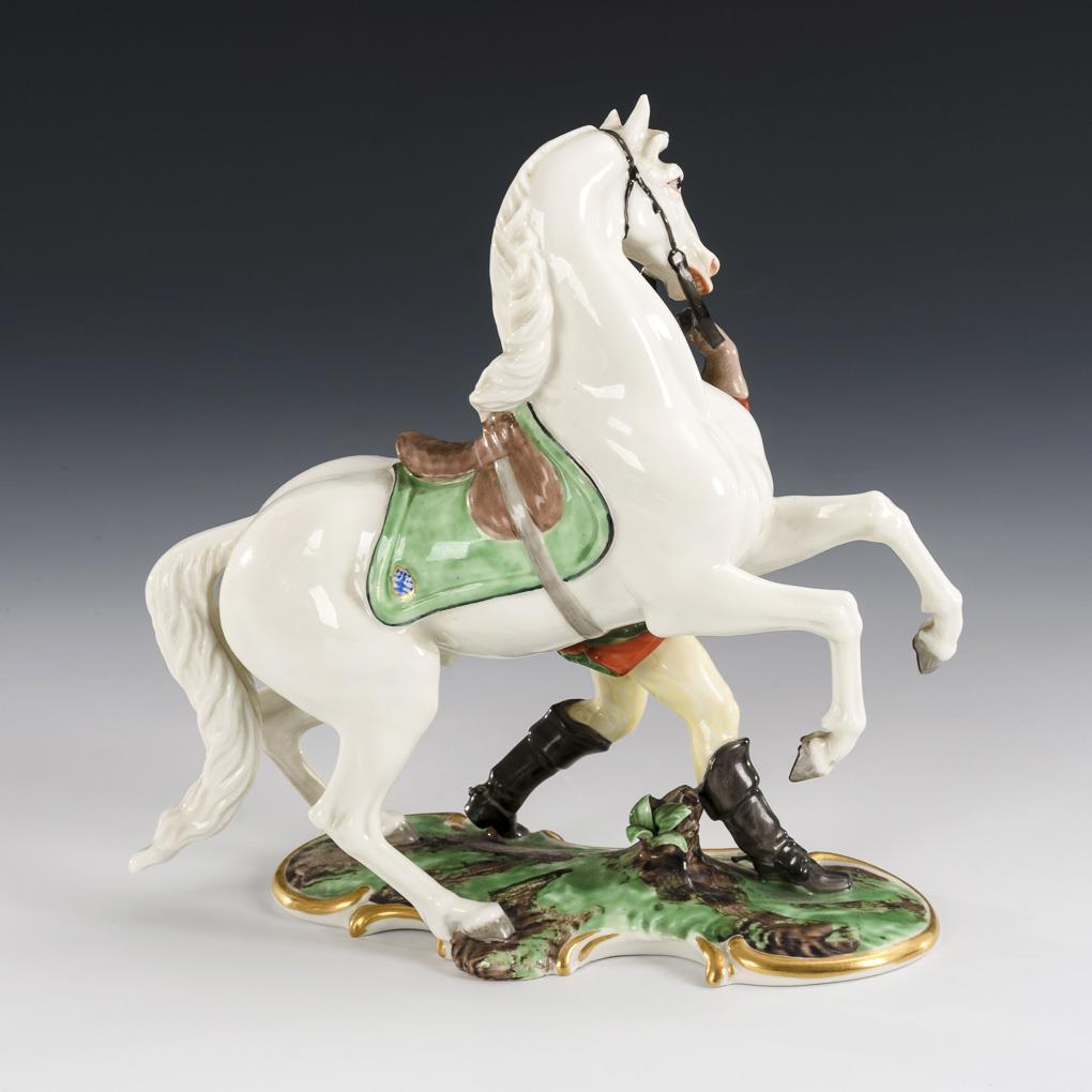 A rising white horse leading hunting rider. Dagger blade missing, reins bumped.
