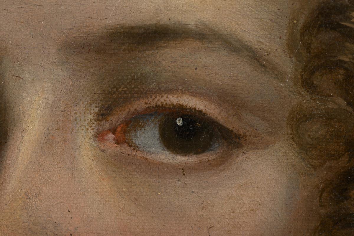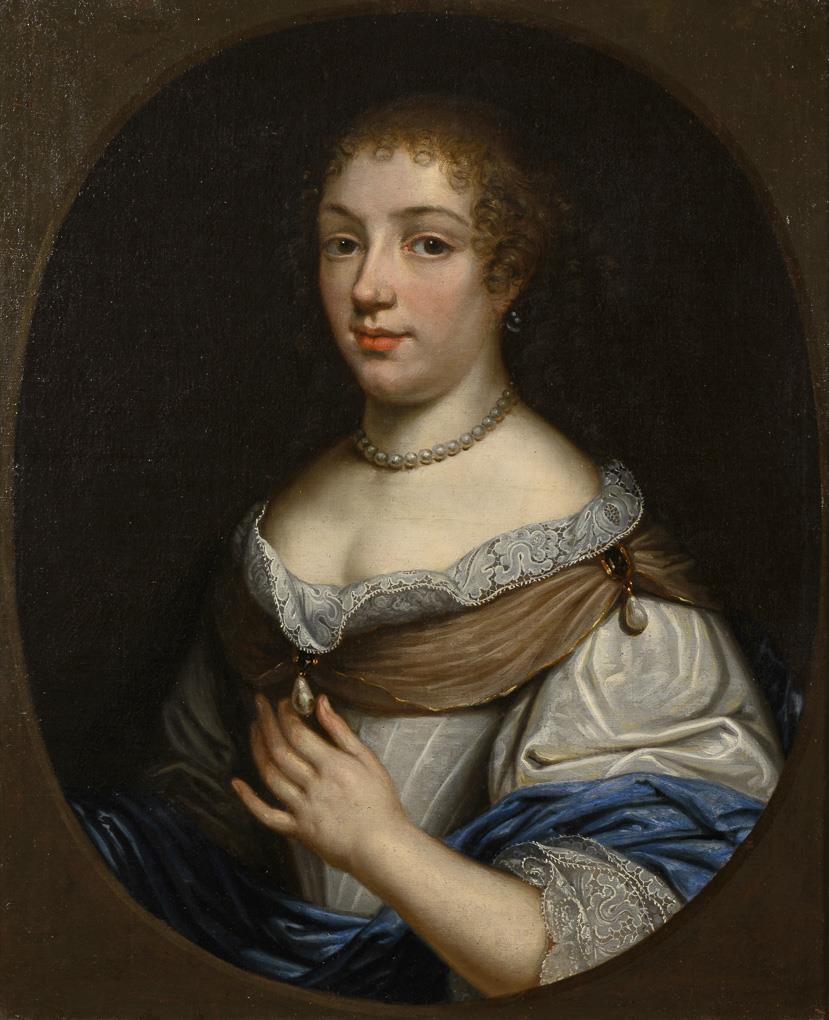 Picture of a young woman in a silk dress with the large pearl between the fingers. Canvas doubled.