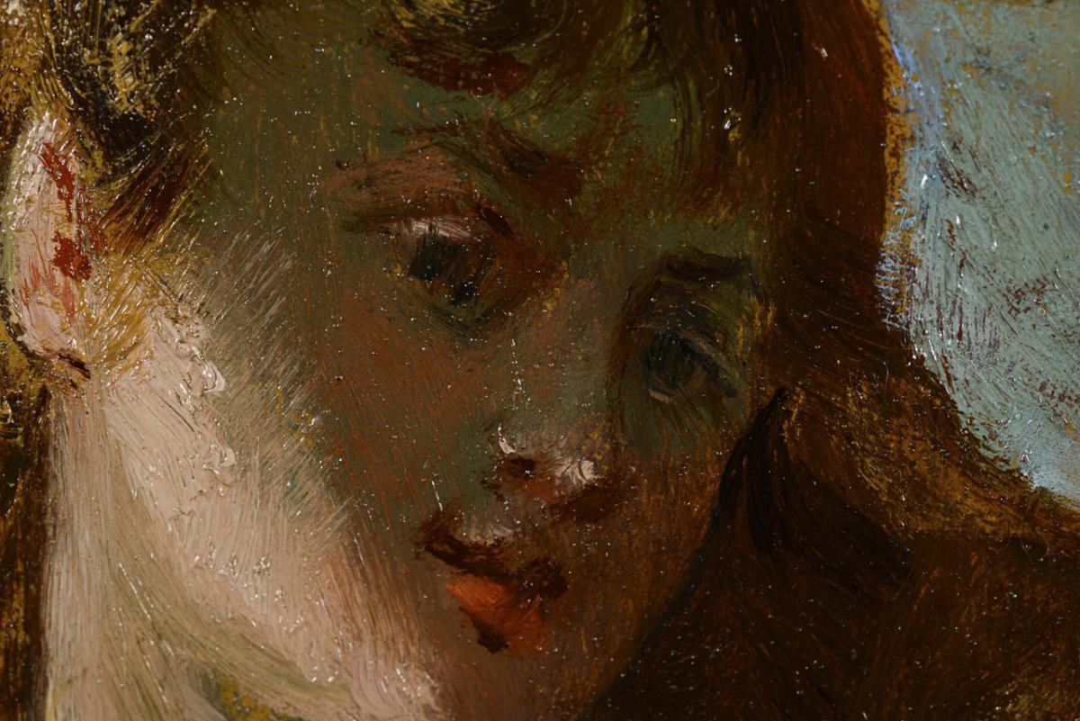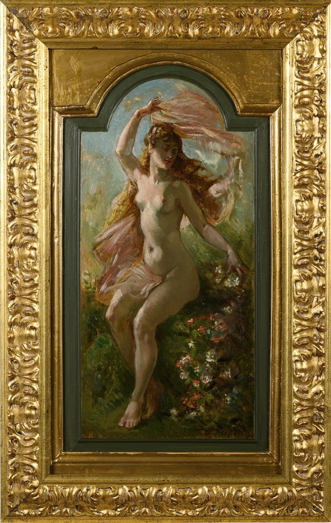 Sitting on a meadow hill female nude with cloth blowing in the wind and flower tendril. Minimal signs of age.