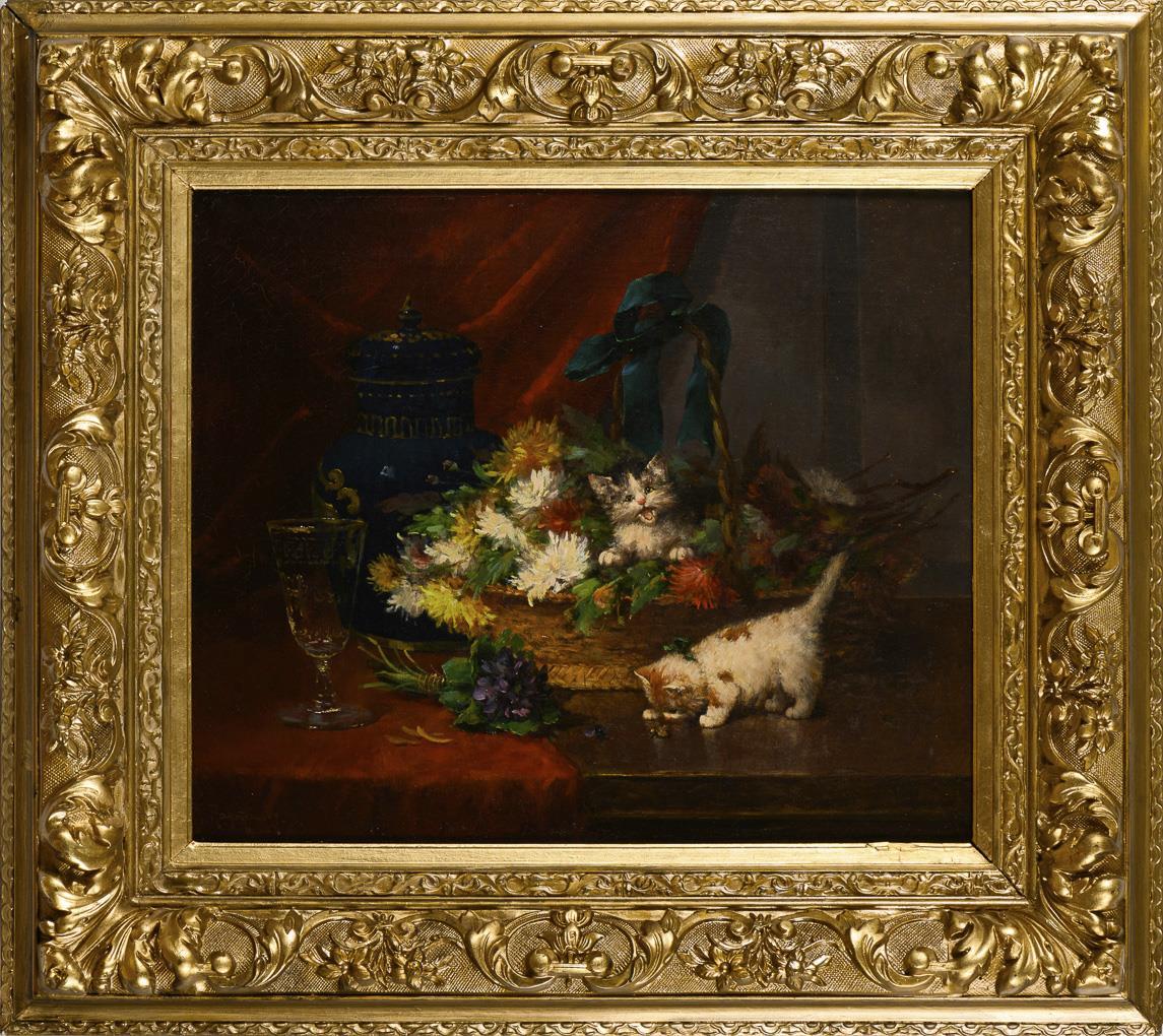 The two kittens at play, with a basket of flowers on a table next to lidded vase and wine glass. Slight signs of age.