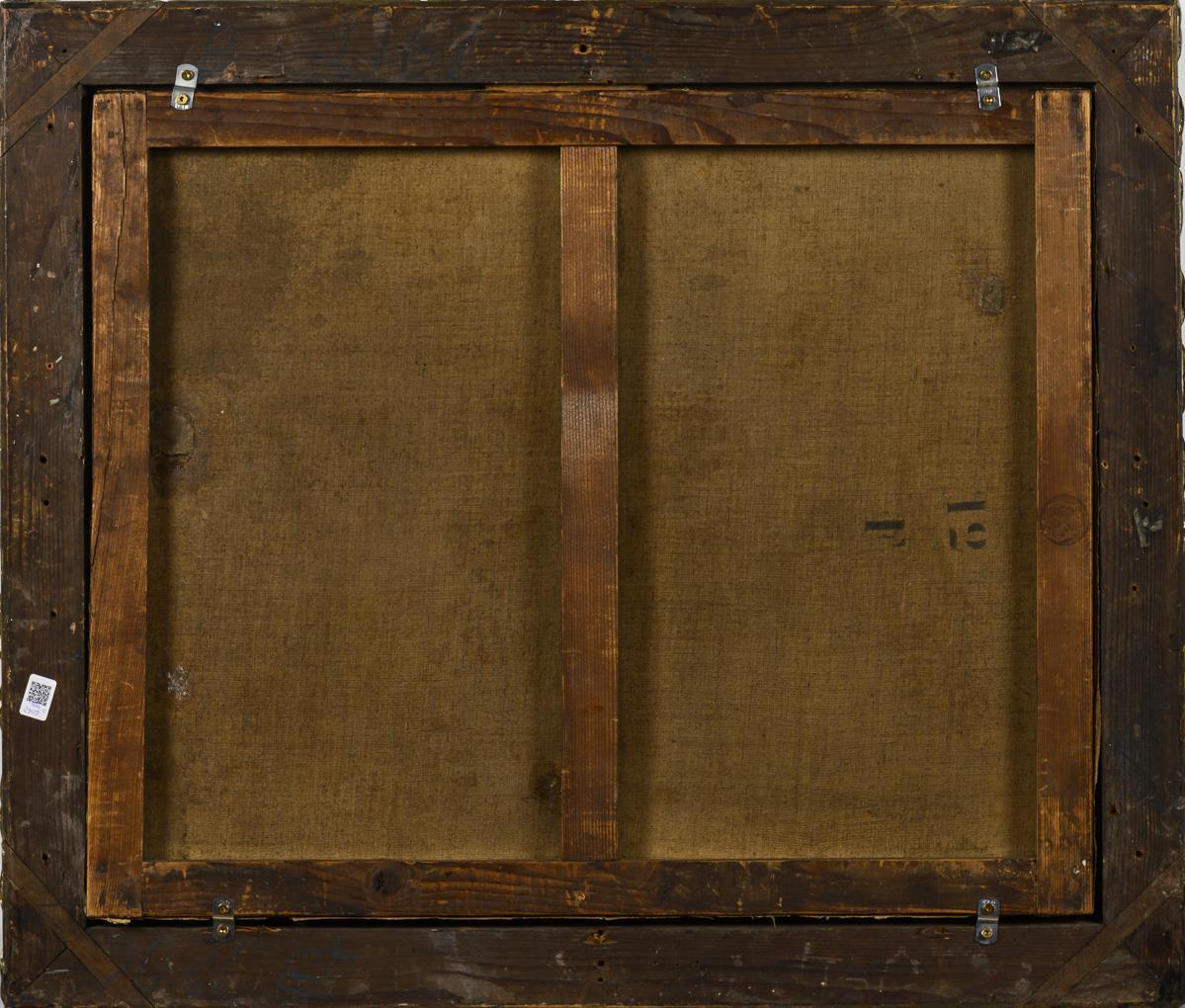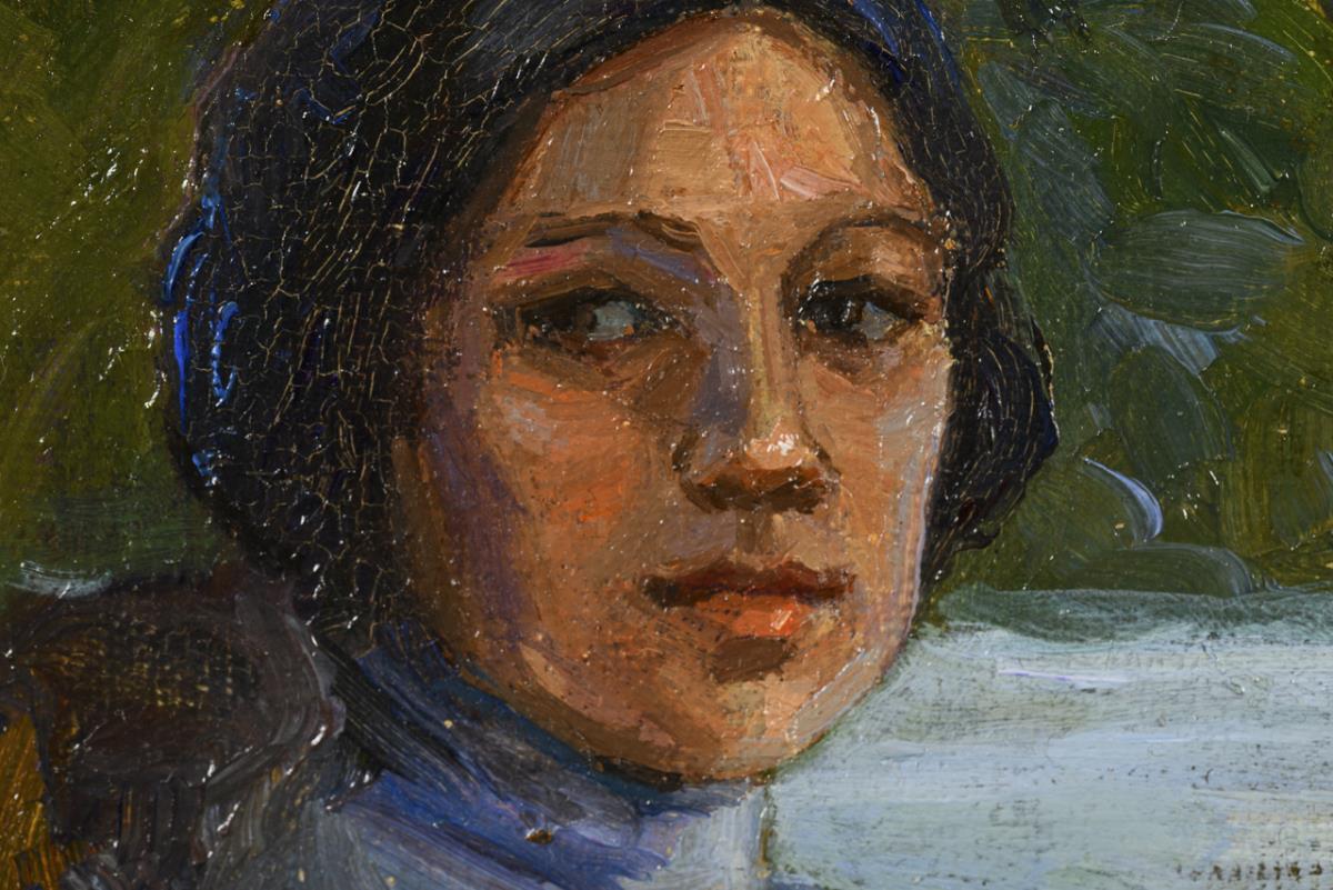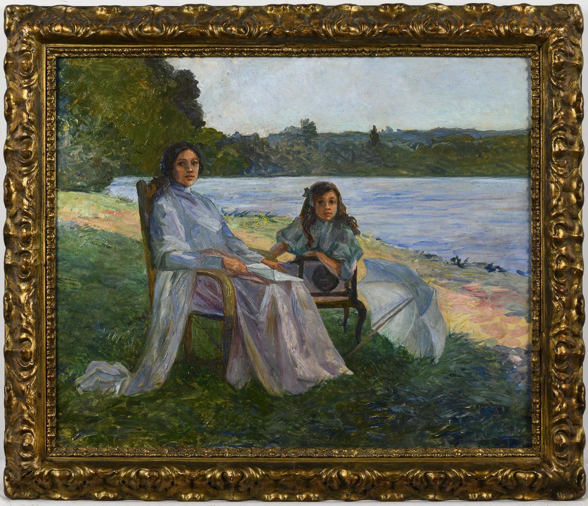 The woman with the child in the shade of a tree on chairs on the shore of the lake. Small restored spots with backstaining.
