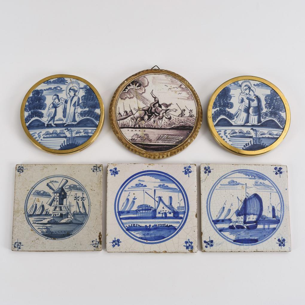 3 square plates with seascapes, boats and mills (13 x 13 cm), 3 round framed plates with figure scenes (Ø ca. 12,5 cm and 14 cm). Slight signs of age and use, 2 round tiles with crack.