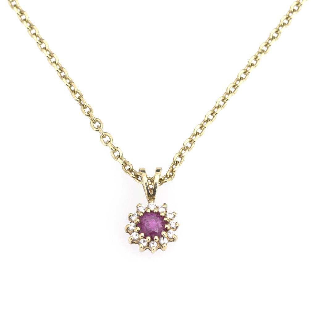 Pendant with ruby and 12 micro diamonds, on anchor chain with ring spring clasp.