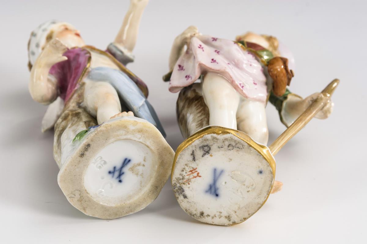 1x running cupid with cloth tied around her head (according to the catalog cupid as a vintner with grapes and grape basket). / 1x Cupid as a shepherdess with bag and staff. 1x both arms and wings restored, 1x both arms, wings. Upper body and hat restored, staff bumped and restored.