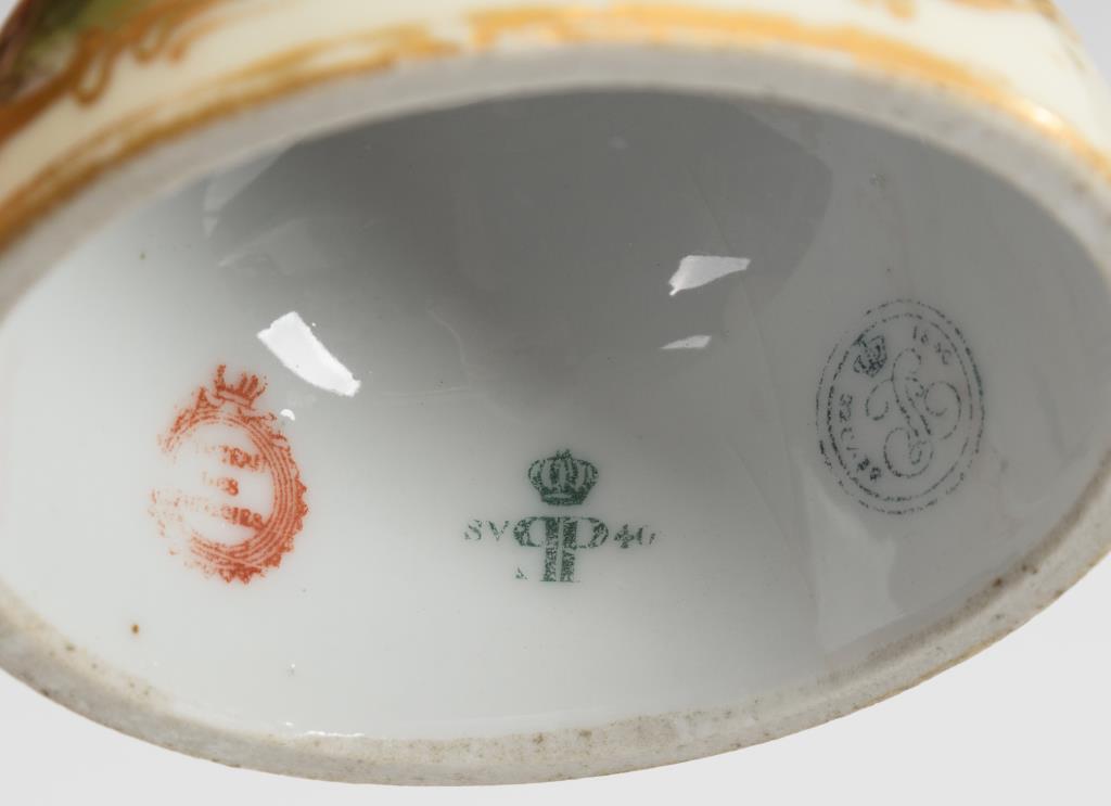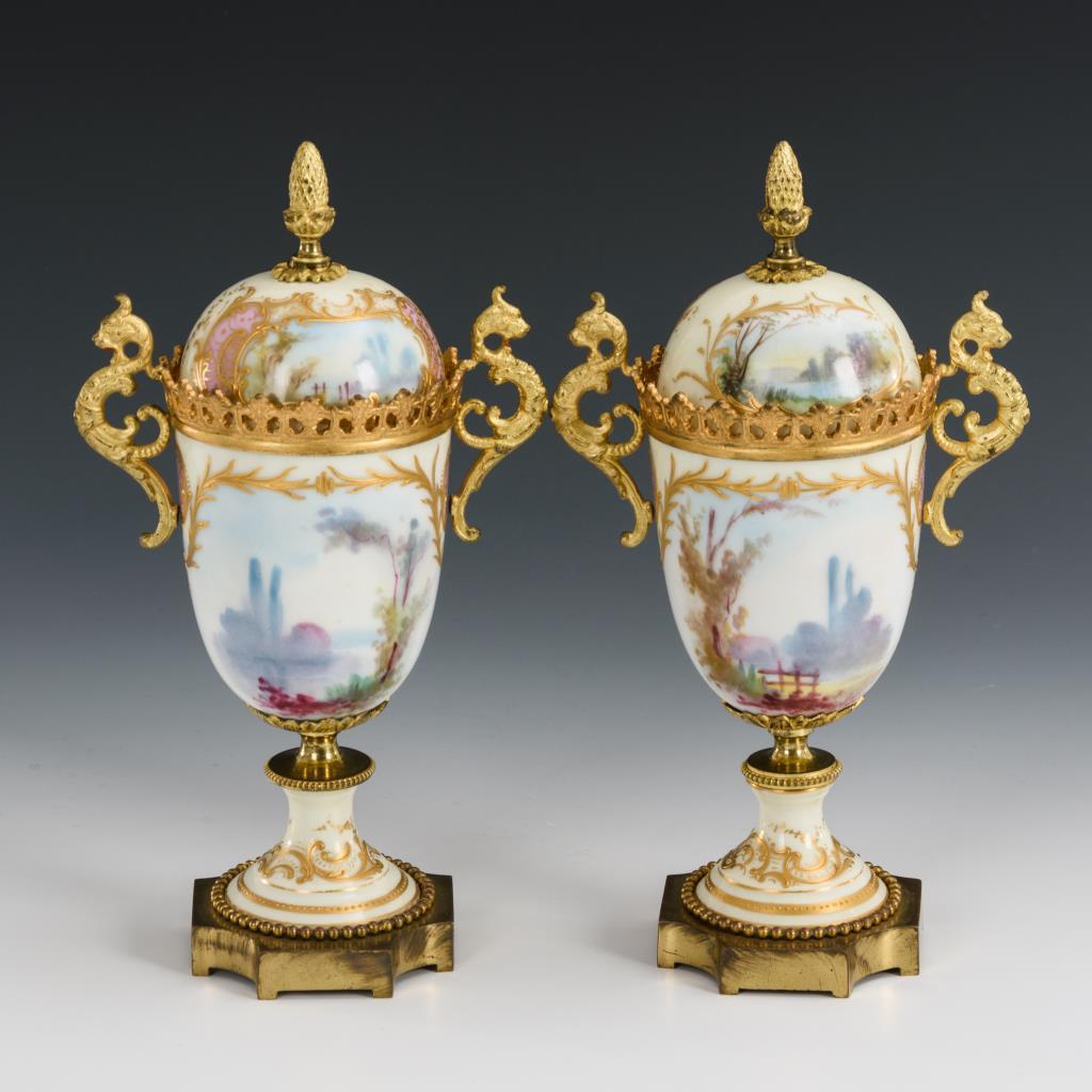 Ovoide Vasen mit bronzemontiertem Rand mit Greifenhandhaben, Knaufdeckel und Rundfuß, auf Bronzeplinthe. Cremefarbener und rosafarbener Teilfond. Mit der Darstellung einer Dame mit Rosenstrauß bzw. eines Herren mit Dudelsack in einer Landschaft. Partiell minimaler Goldabrieb.