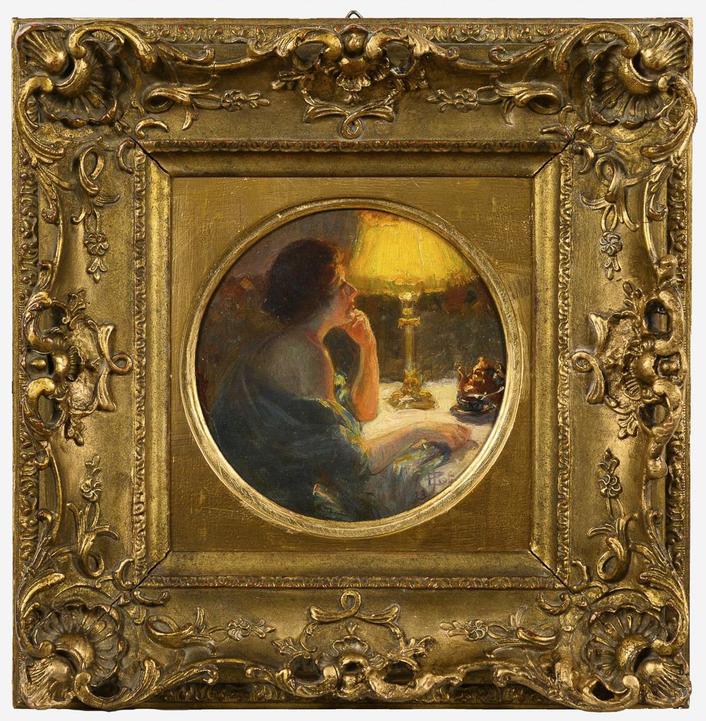 In the warm light of the table lamp before a teapot and -cup sitting young woman with bared shoulder. Somewhat retouched.