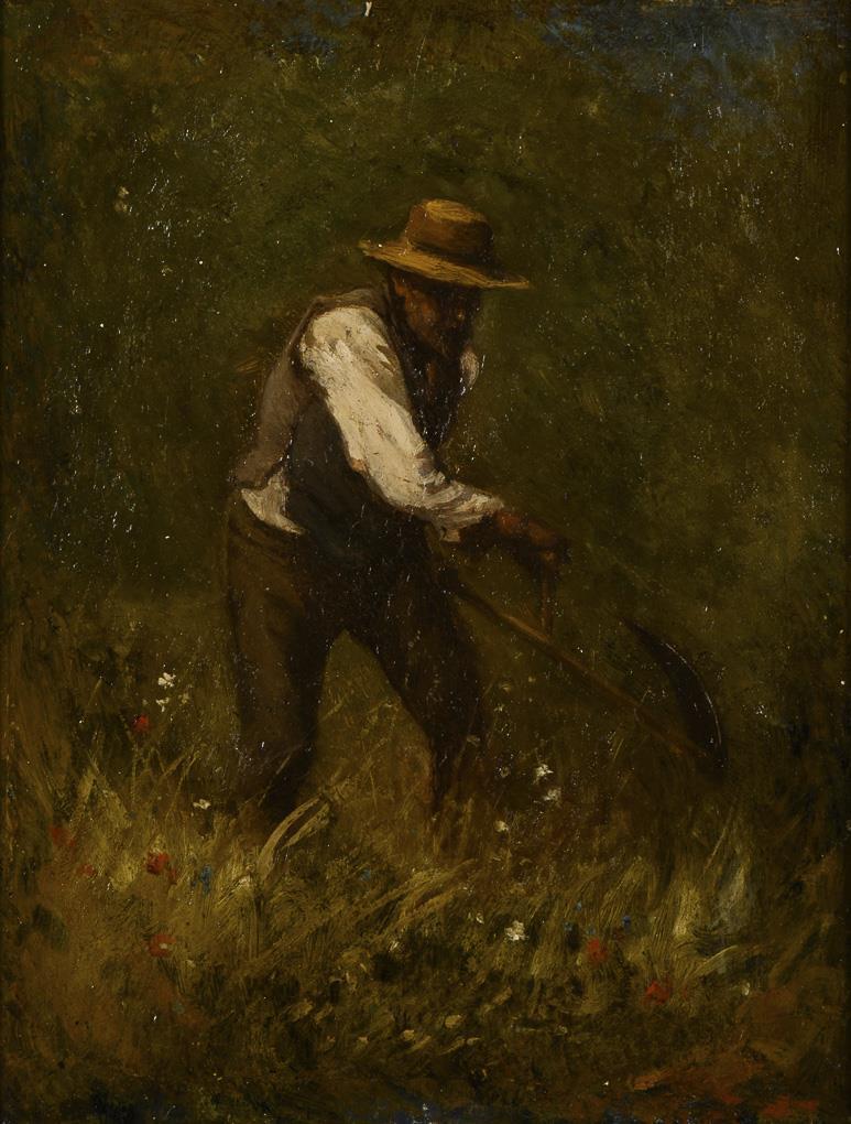 The reaper with the scythe on the flowering meadow in the sunshine. Slight signs of age.