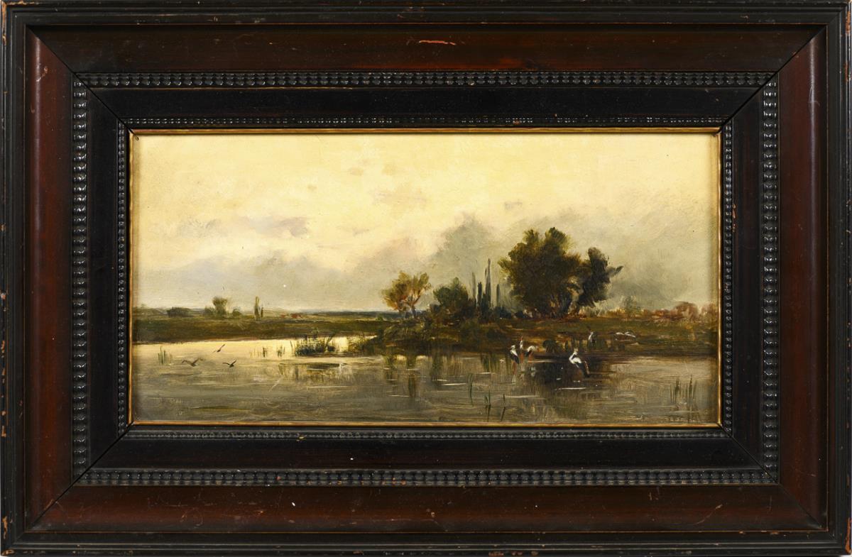Shining evening sky reflected in the water above the vast landscape with storks on the shore. Slightly retouched.