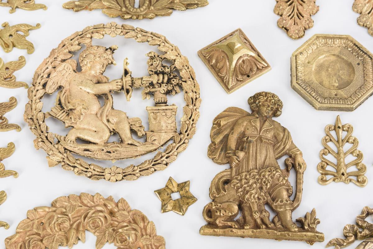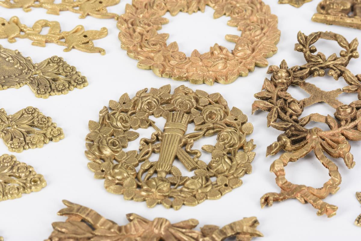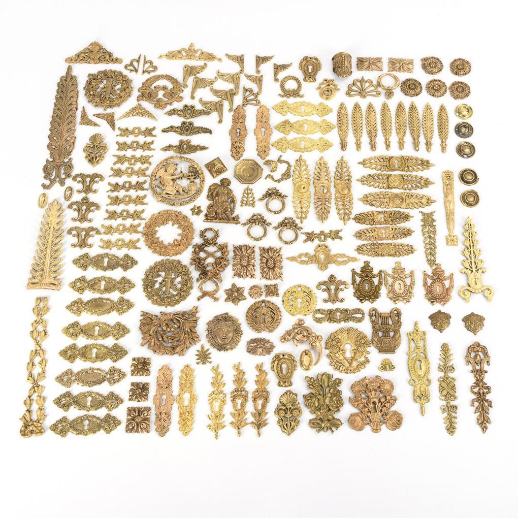 Furniture fittings of various styles; often Louis Seize and Empire, also Rococo and Art Nouveau. Often recasts. Frequently foundry raw material.