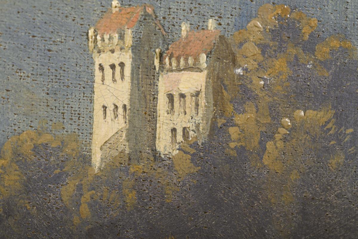 View over the hills to the castle behind trees in the sunshine. Restored.