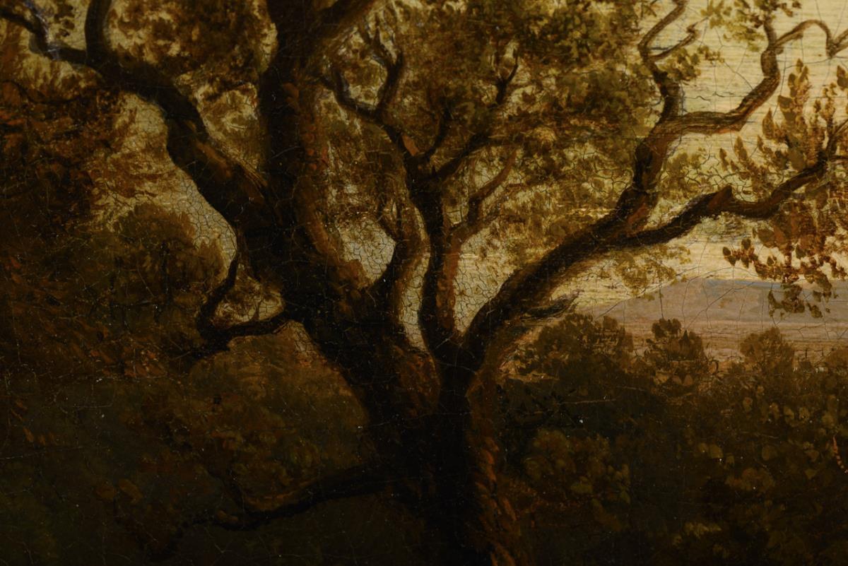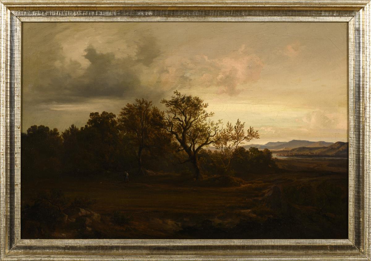 Staffage figure at the edge of the forest not far from the river with the city under cloudy sky. Canvas doubled.