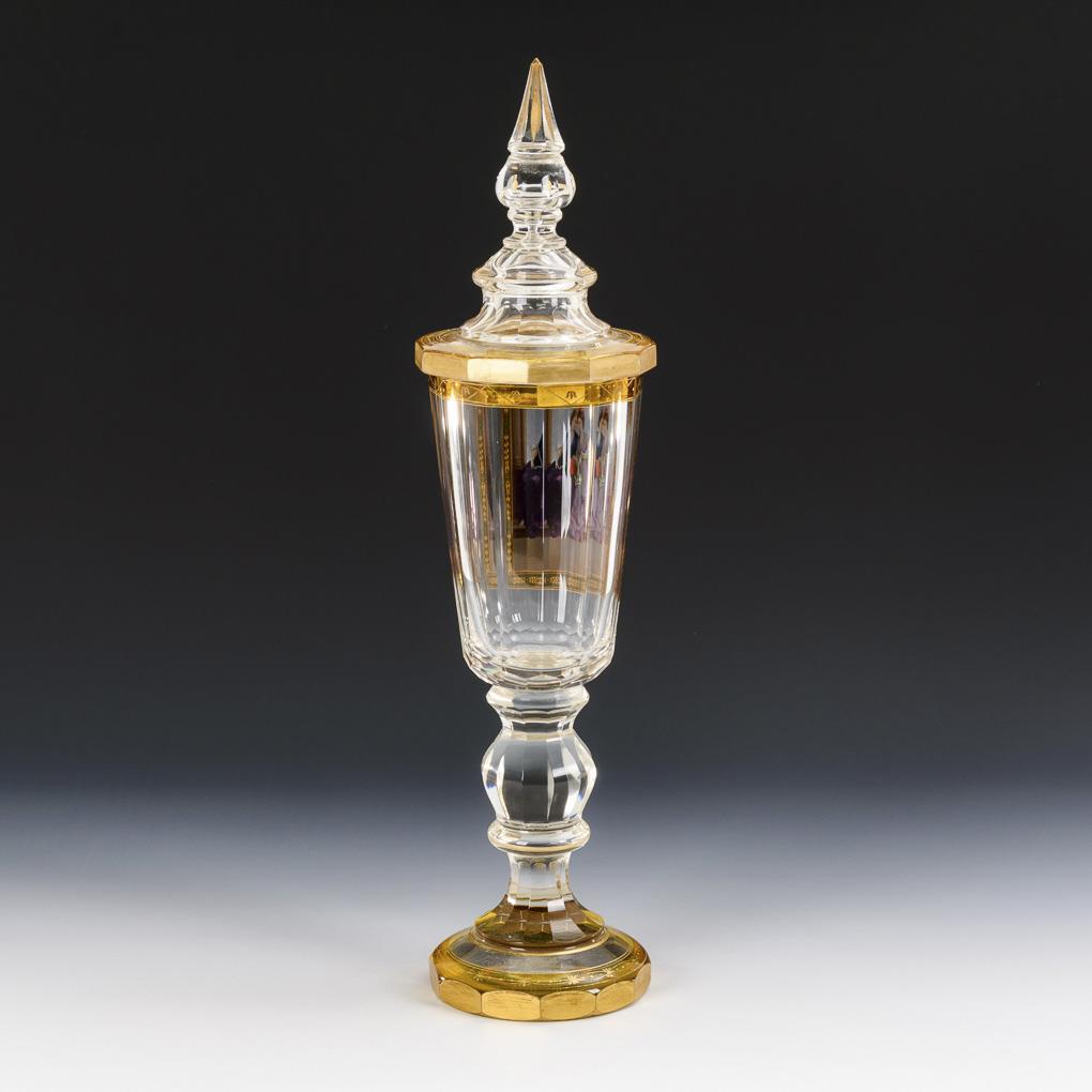Faceted goblet with conical dome, baluster stem, knobbed lid and round base. Designed in the style of Kothgasser glasses, with the obverse depiction of two women with harp and music book. Partially minimal gold abrasion.
