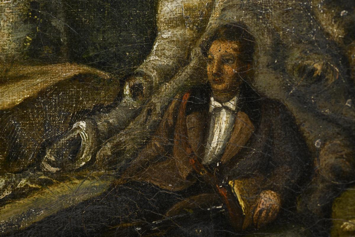 Landscape painter 19th century: Hunters resting at the edge of the forest