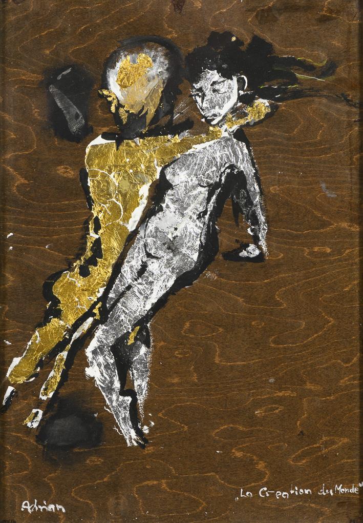 Two intimately entwined figures and a female figure with raised arms.