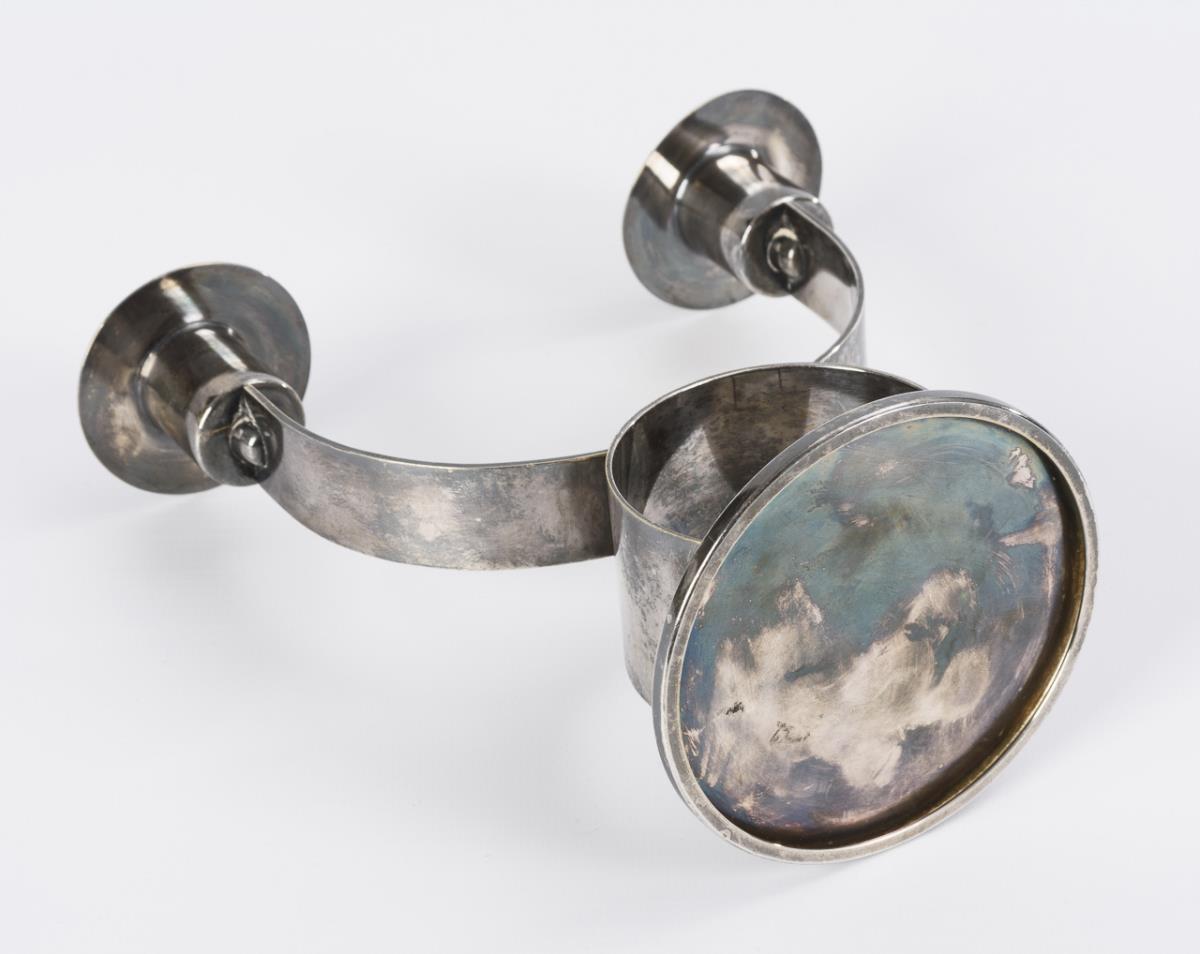 Disc base, ring shank, bow arms, roller grommets. Kink mark on wax plate.