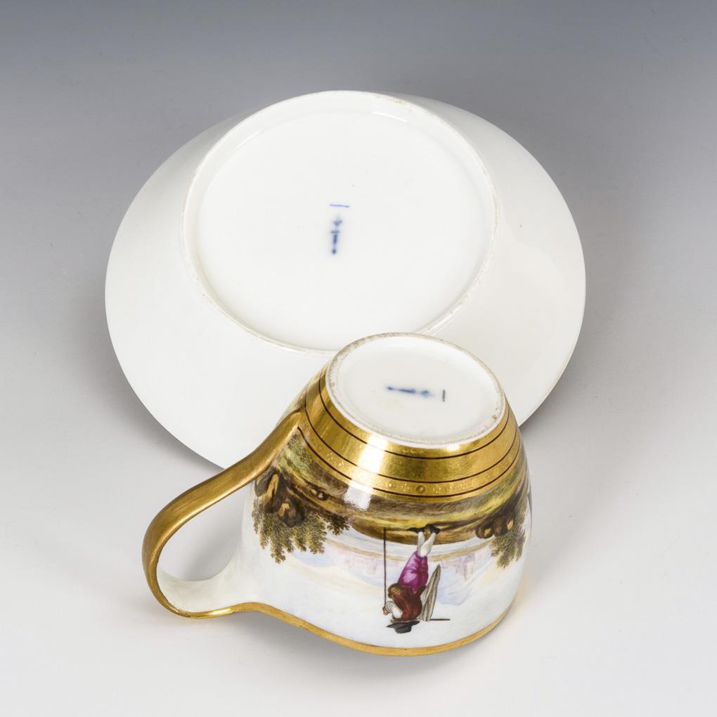 Polychrome painted, gold decorated. H cup 7.5 cm, Ø original saucer 13 cm.