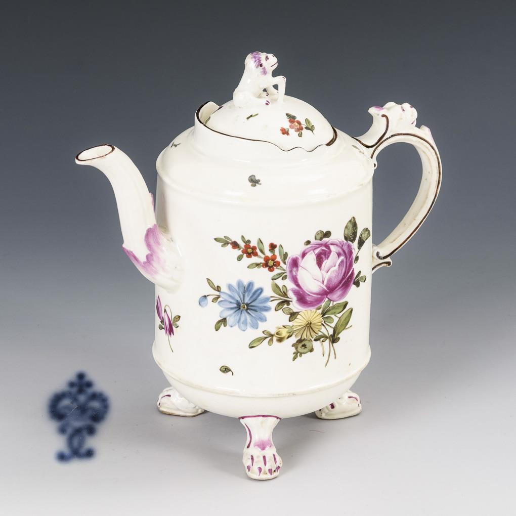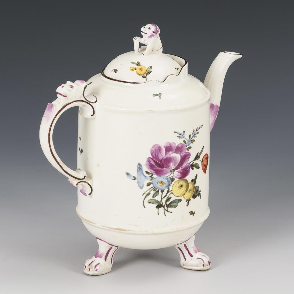 Cylindrical jug with three paw feet, lion head handle and lid with lion knob. With floral painting and brown edges. Restored.