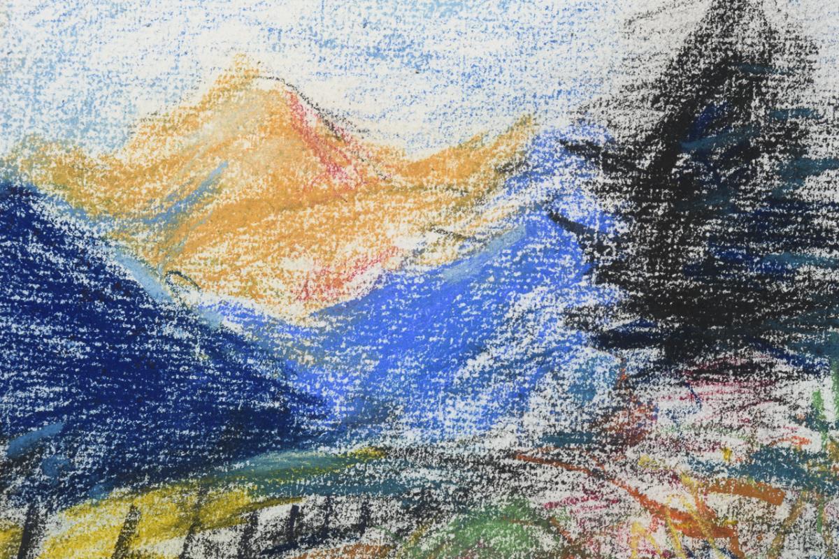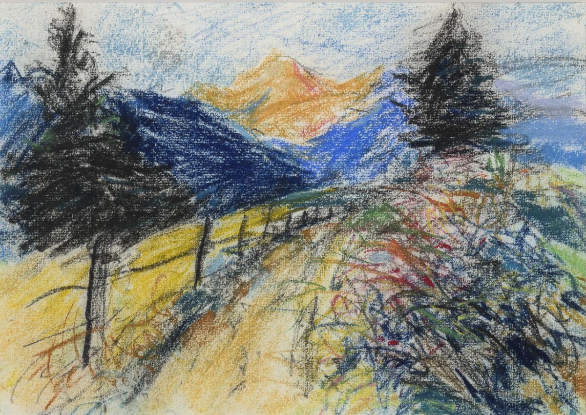 Rising path in the mountains with view over the crest to the mountains on the horizon. Enclosed handwritten postcard of the artist, guestbook for the exhibition "Enchantment through color - Alexander von Szpinger. 30.11.1996 to 16.2.1997" and photos of other Szpinger paintings.