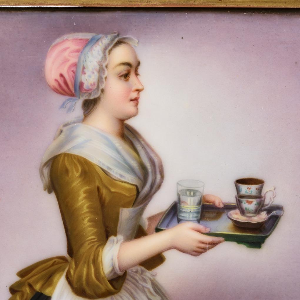 Rectangular picture plate with the famous depiction of a maid with tray, after the pastel of the painter Jean Etienne Liotard (1702-1789) in the Old Masters Picture Gallery in Dresden. Small bump on the frame.