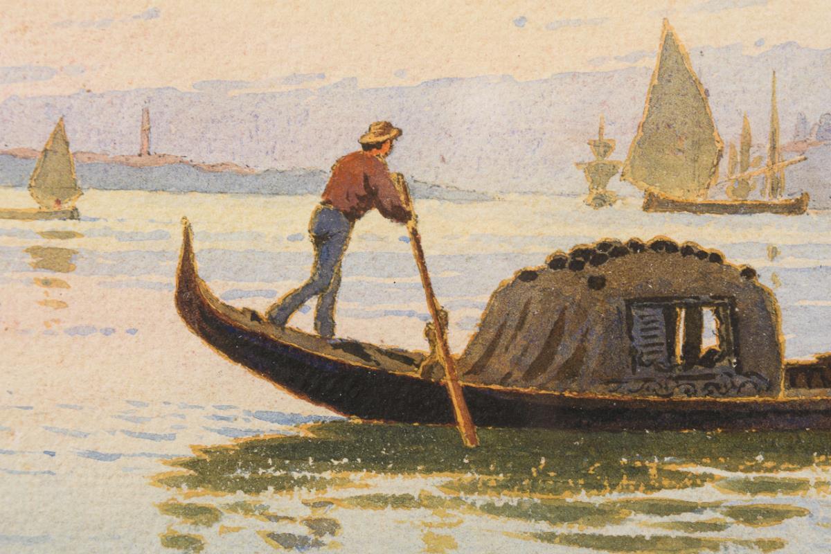 Gondolier in the evening light near the church of Santa Maria della Salute. A small tear at the edge.