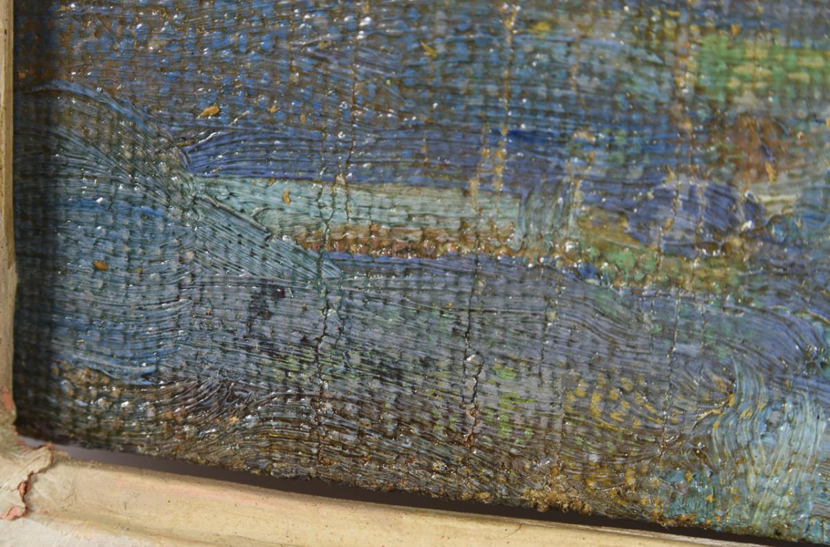 Late Impressionist, sunny landscape with shallow river course under a blue sky. canvas doubled.