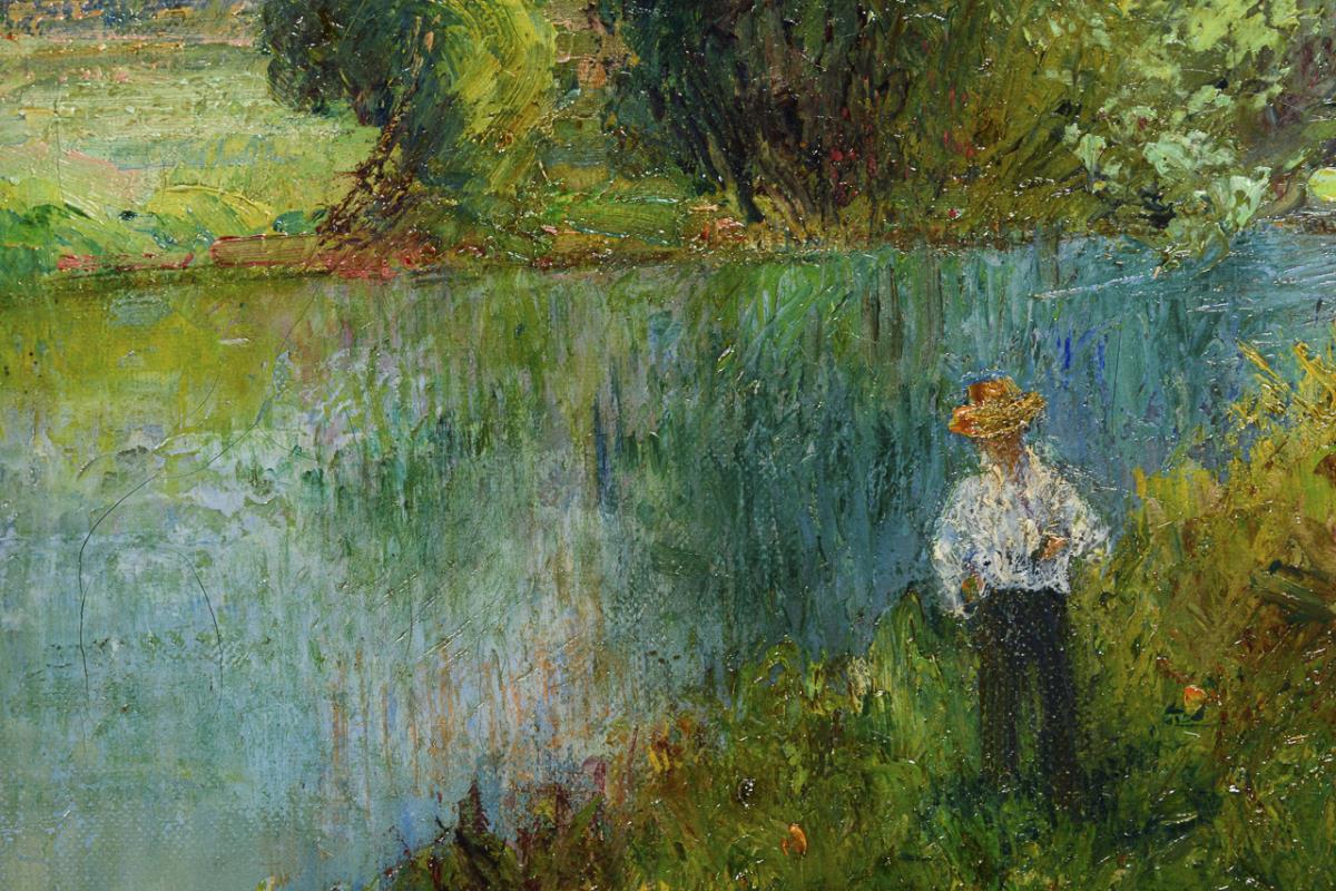 Staffage figure on the riverbank with a view across to the summer landscape. A restored spot with back paste.