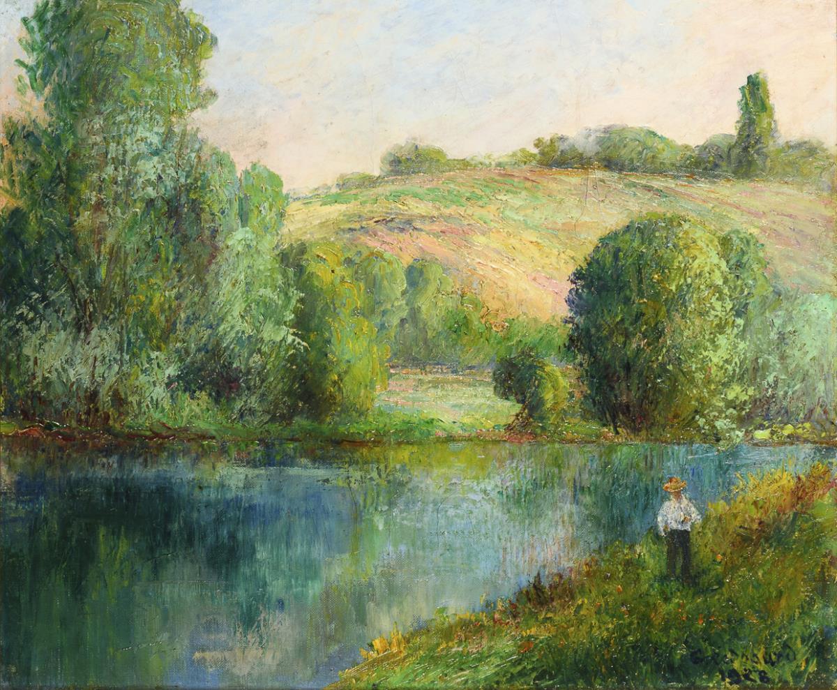 Staffage figure on the riverbank with a view across to the summer landscape. A restored spot with back paste.