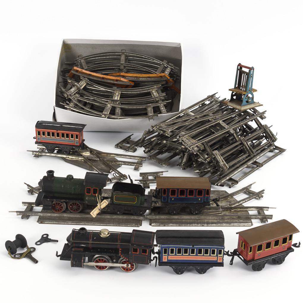 0 gauge. green Bing locomotive with defective spring mechanism. / Green tender. / Black locomotive with intact movement. / 4 passenger cars. / In addition, numerous tinplate rails and 5 switches. Enclosed 2 keys. Traces of age, small defects.