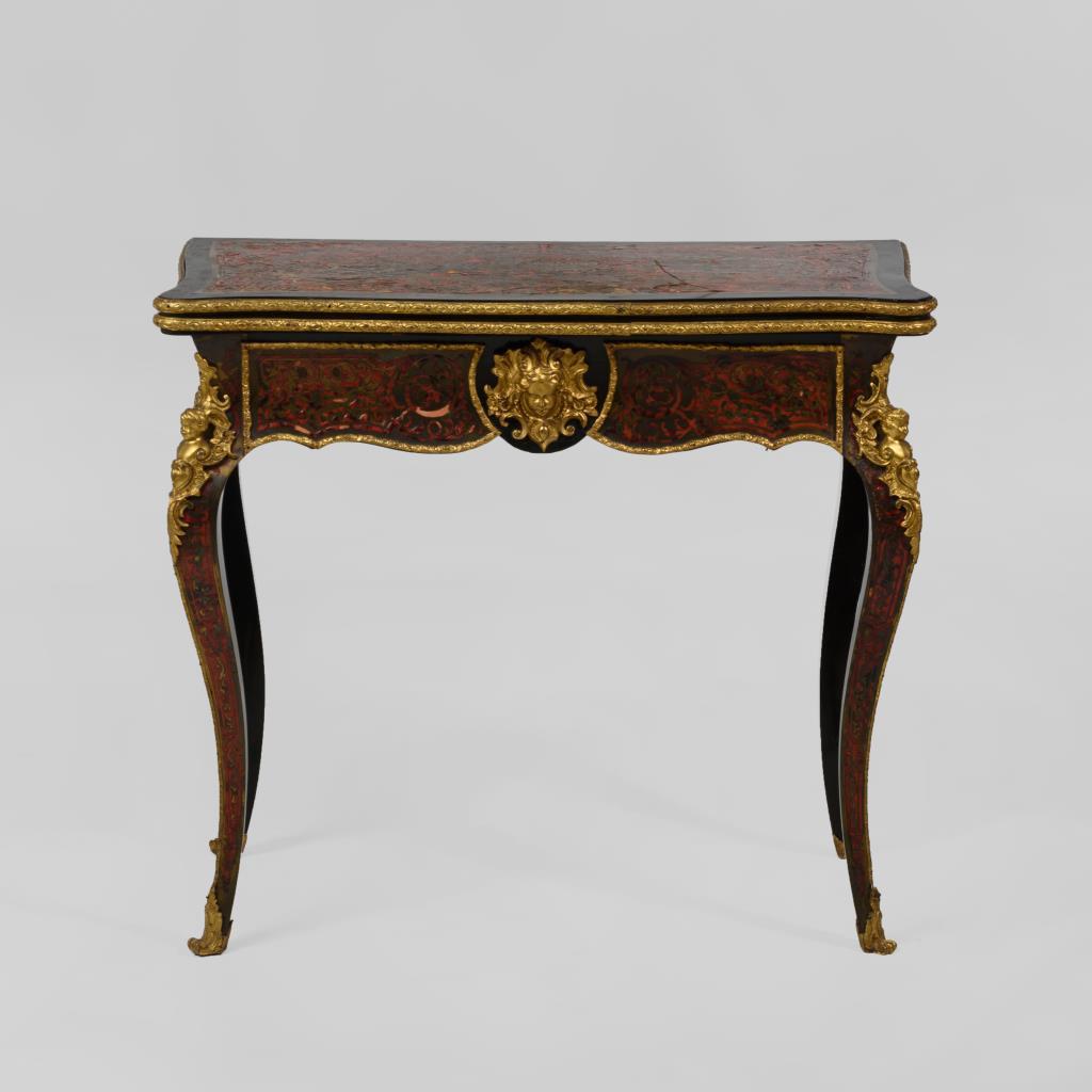 Prunkvoller Klapptisch im Boulle-Stil mit geschwungenen Formen und arabesken Messingintarsien in flächendeckender, reich ornamentaler Gestaltung mit Rotlack und ebonisiertem Holz, reich verziert mit Ormolu aus Puttenköpfen. Marketerie mit Defekten, Alters-/Gebrauchsspuren.