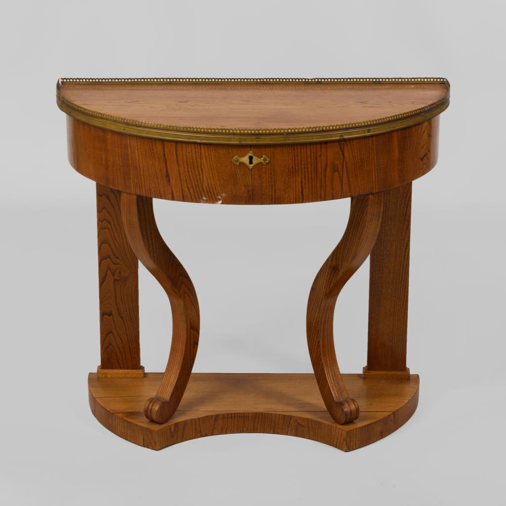 Halbrunder, aufklappbarer Nähtisch mit s-förmigen Volutenstützen und Messingbalustrade; innen mit gedeckelten Fächern. Alters-/Gebrauchsspuren, Trockenrisse.