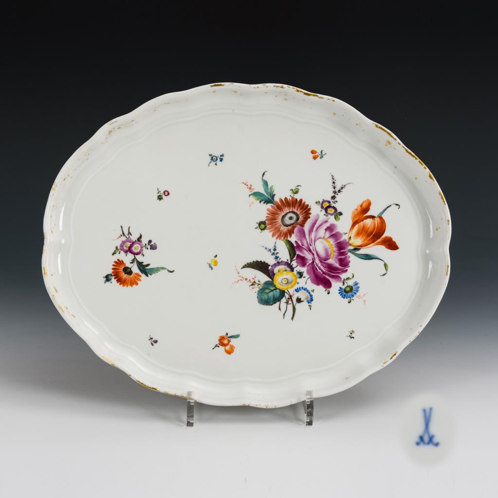 Ovales Tablett mit passig geschweiftem Rand. Im Spiegel ein Blumenbukett und Streublümchen. Gold berieben.