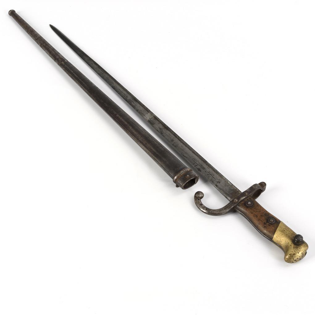 Type "Mle. 1874 Grass", tapered narrow blade with wide pinned spine. Handle made of wooden scales with brass end. Metal scabbard. Slight signs of age.