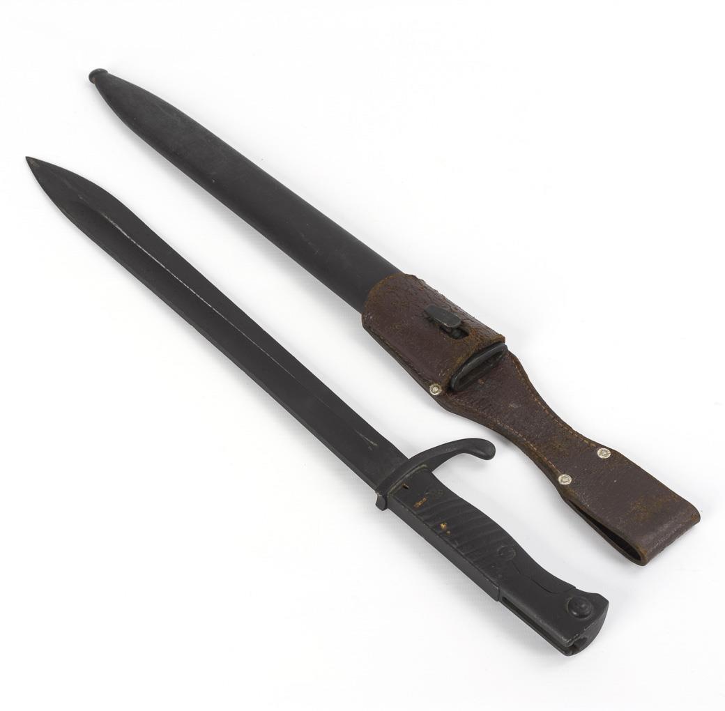 Single-edged blade, widening to the point, point in the centerline. Ribbed wooden handle. Metal scabbard and brown, leather coupler with indistinct embossed mark. Complete, younger blackened.