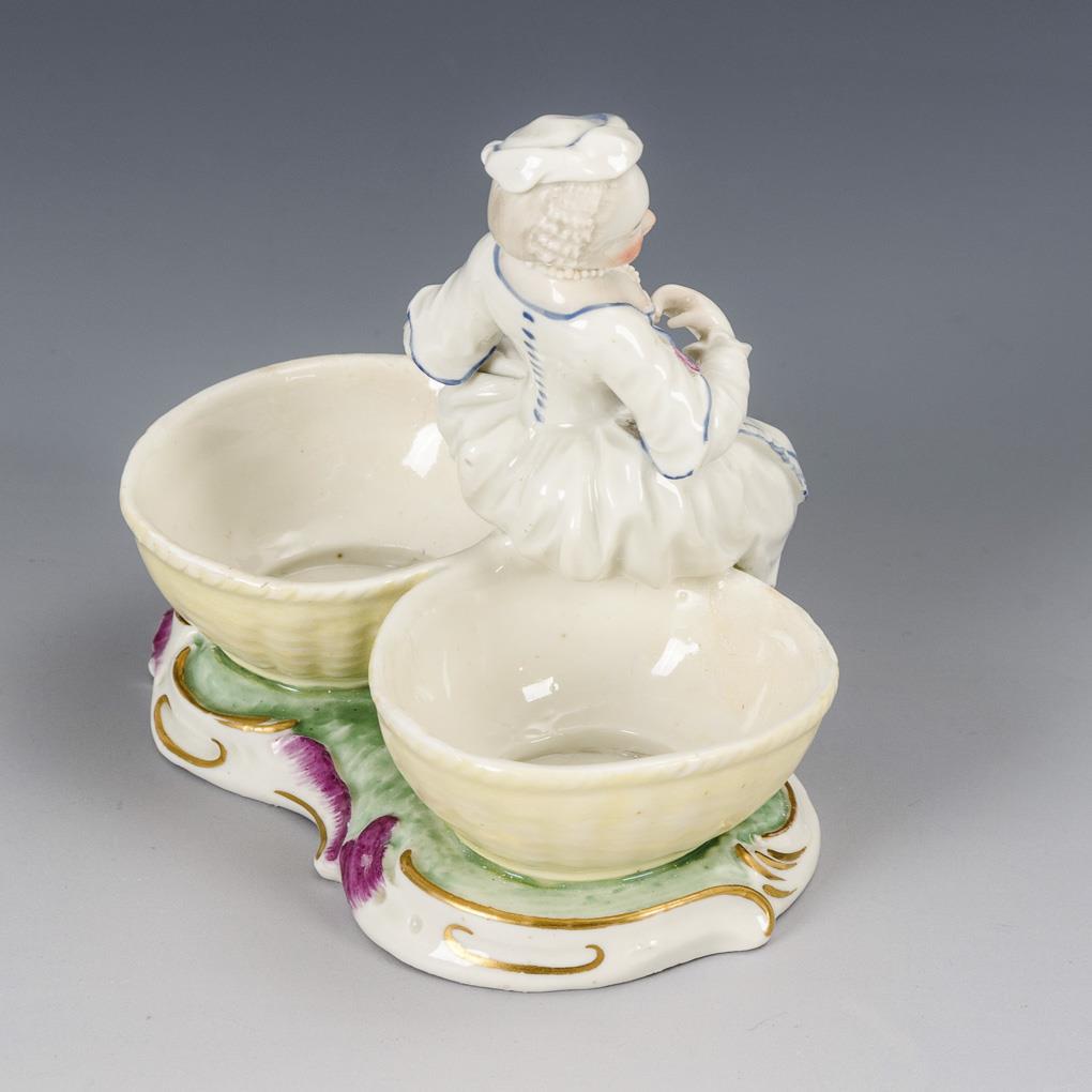 Girl. sitting on two baskets as spice bowls Short burn crack in base, both baskets with rim restoration, left hand of girl restored.