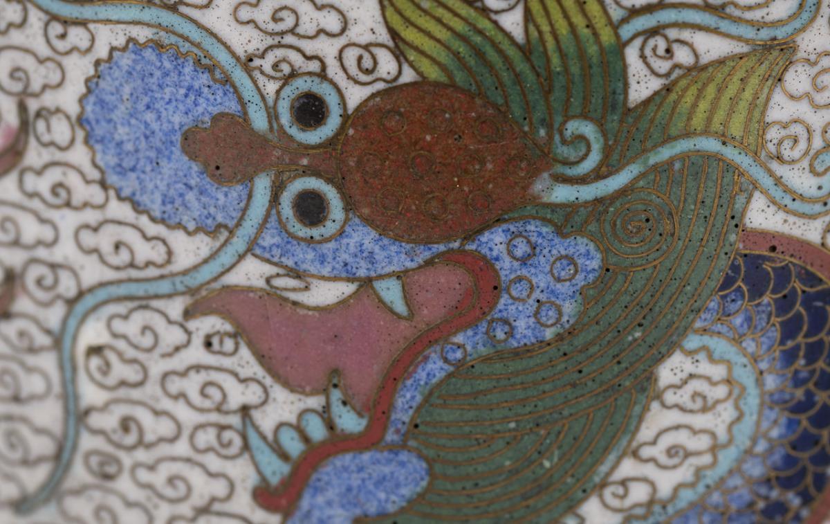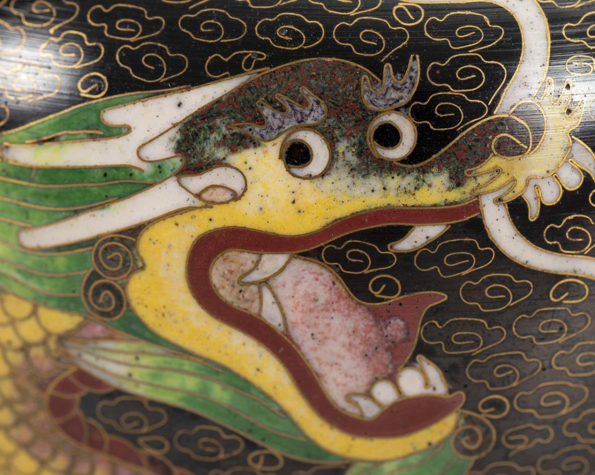 Baluster vase with cloud decoration on white background and blue dragon couple over waves. / Bellied vase with cloud decoration on black background and yellow dragon pair.