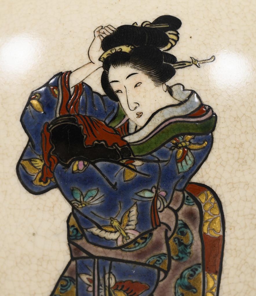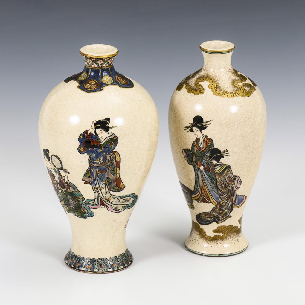 Very fine painting in enamel colors and gold paint, probably satsuma. Women, probably geishas, performing everyday tasks. Very fine glaze craquelure. Larger vase with characters on the wall. Larger vase with hairline crack next to characters.