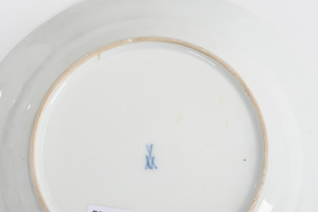Suppenteller mit dem Reliefdekor "Dulong". Im Spiegel eine galante, goldspitzengerahmte Szene.