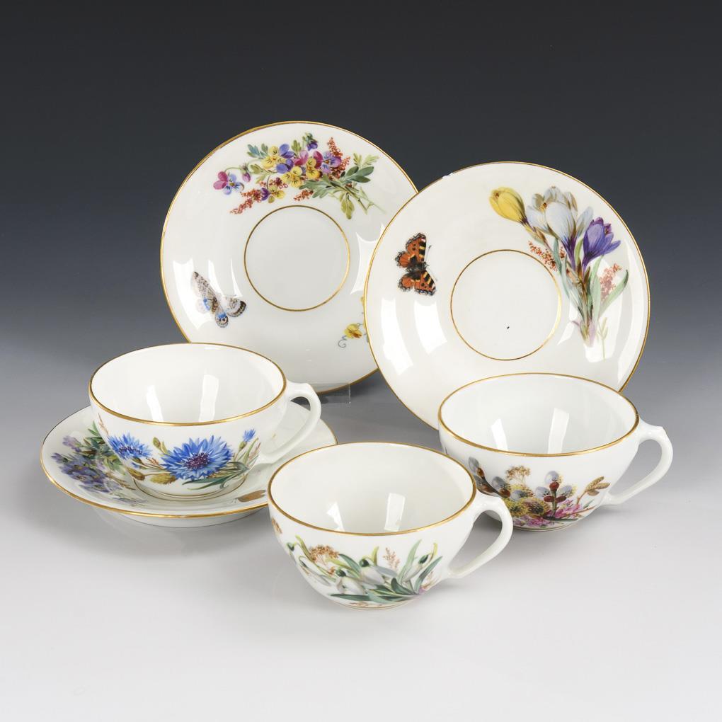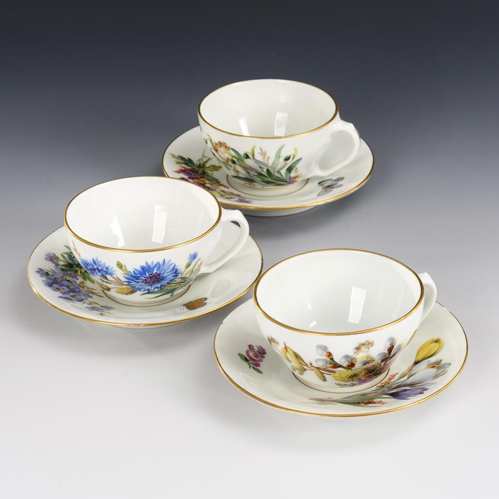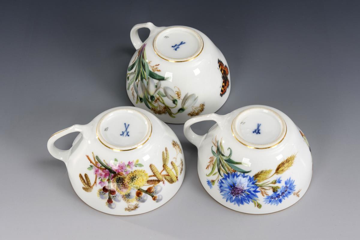 3 Art Nouveau cups with floral and insect painting. Meissen.