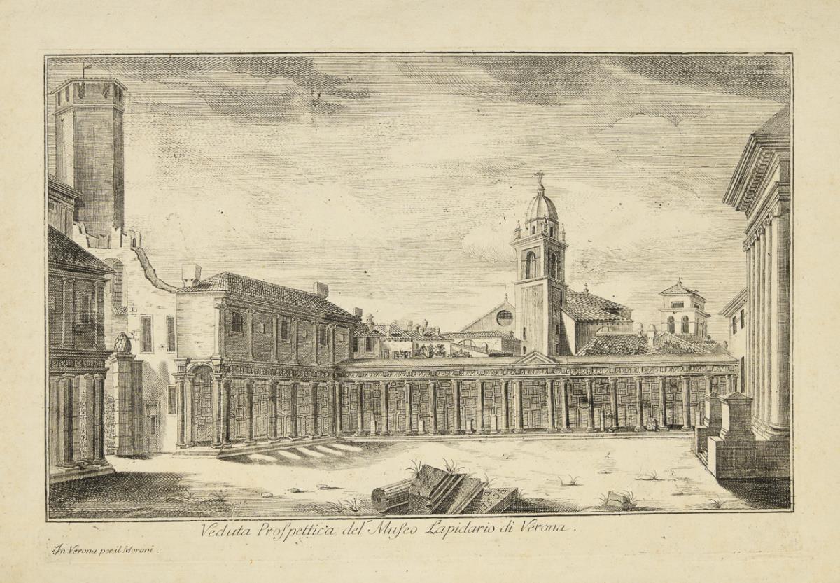 Central perspective view of the Museo Lapidario Maffeiano in Verona, inscribed "Veduta Prospettica del Museo Lapidario di Verona / In Verona per il Moroni". Kink and grip marks, some foxing.