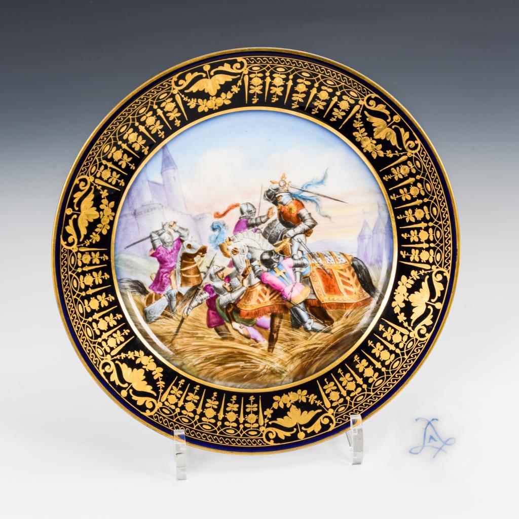 Teller mit reicher floraler, radierter Goldmalerei auf der kobaltblauen Fahne, im Spiegel die Darstellung einer Ritterschlacht vor Zelten und einer Burg.