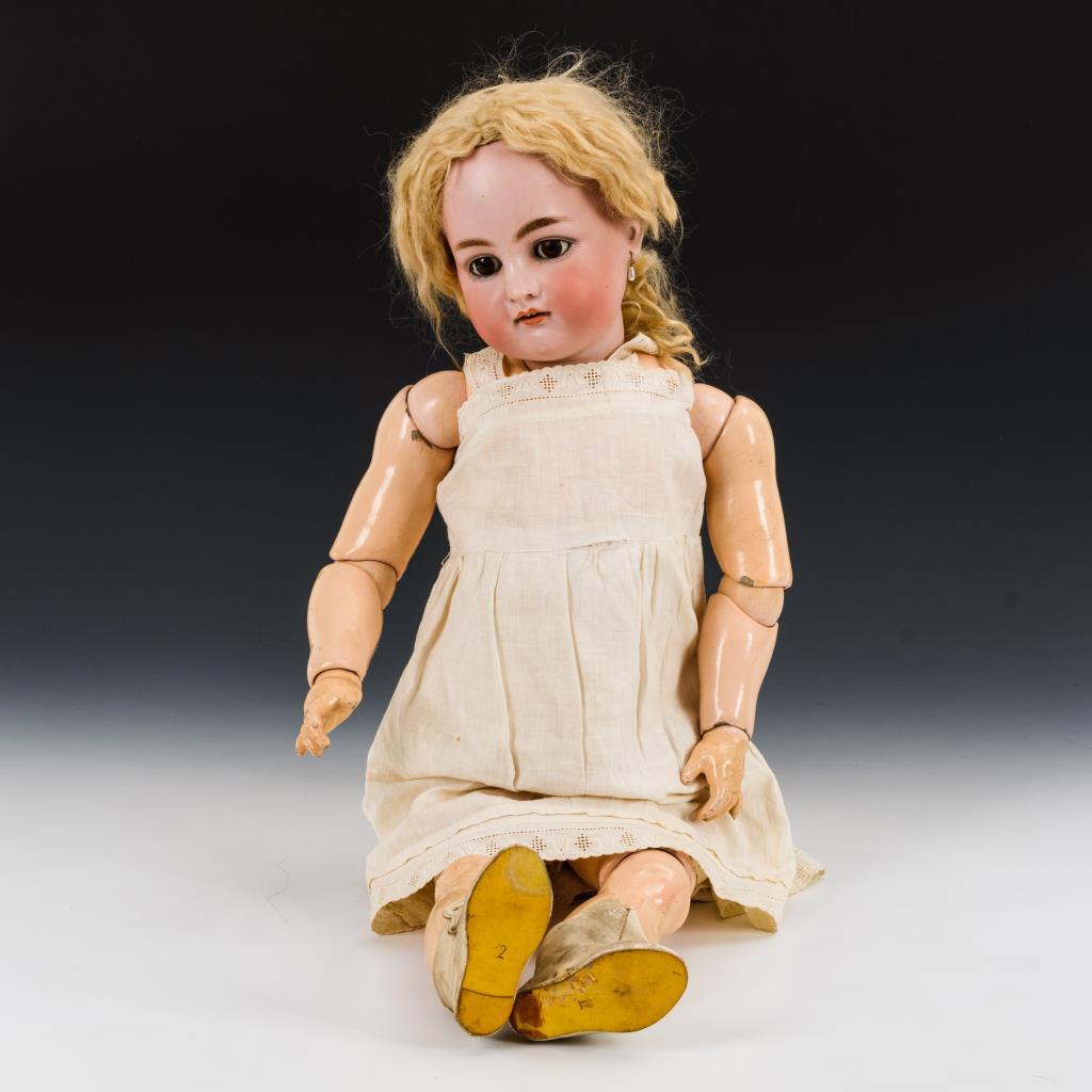 Kurbelkopf, braune Schlafaugen, modellierte Augenbrauen, offener Mund, Zähnchen, Ohrringe, feste blonde Mohairperücke. Schön ausgeformter, 17-teiliger Compositionskörper. Alte Unterwäsche, alte weiße Lederschuhe. Partielle Körperdefekte, Finger intakt.