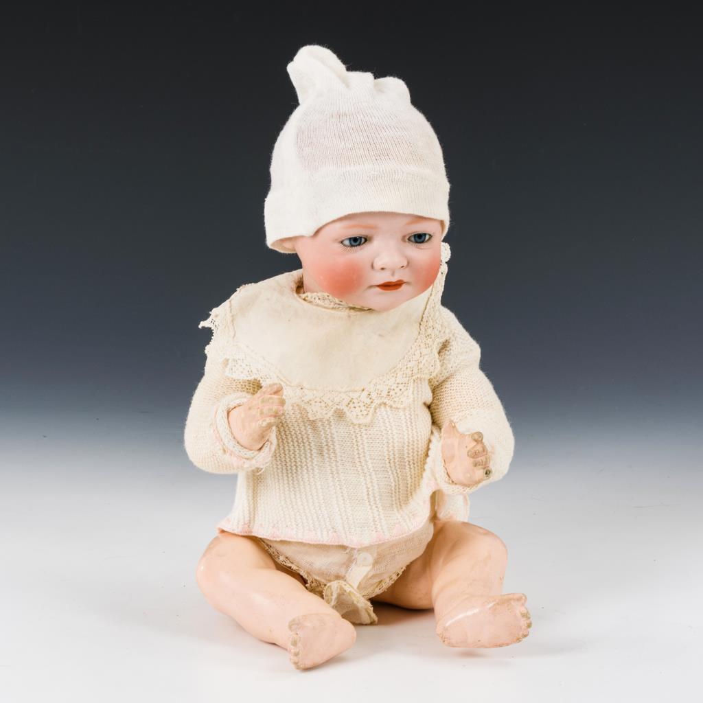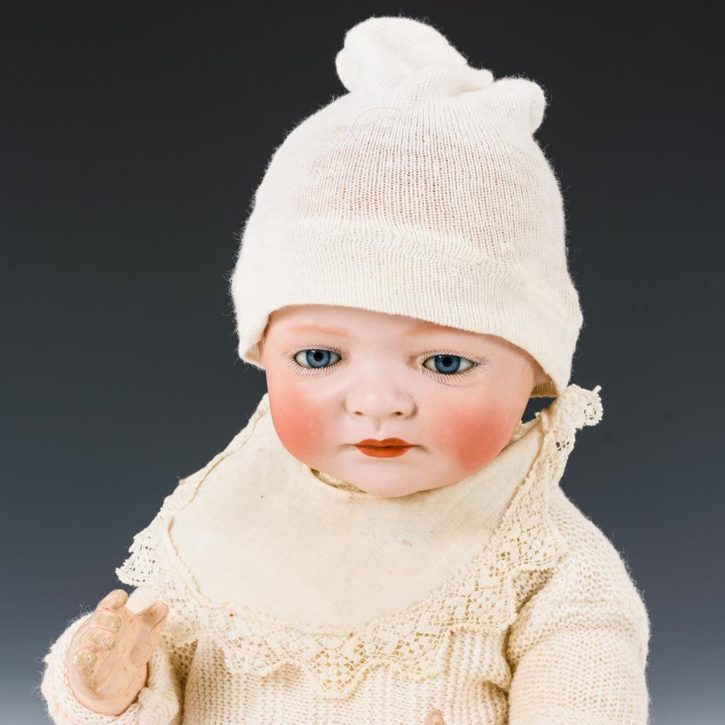 Seltener Typ Neugeborenes, Vollkopf-Kurbelkopf, schmale blaue Glasaugen, geschlossener Mund und braun getönter, lockig modellierter Haarboden. 5-teiliger Sitzbabykörper. Weiße, alte Babykleidung. Kleiner Finger links fehlt.