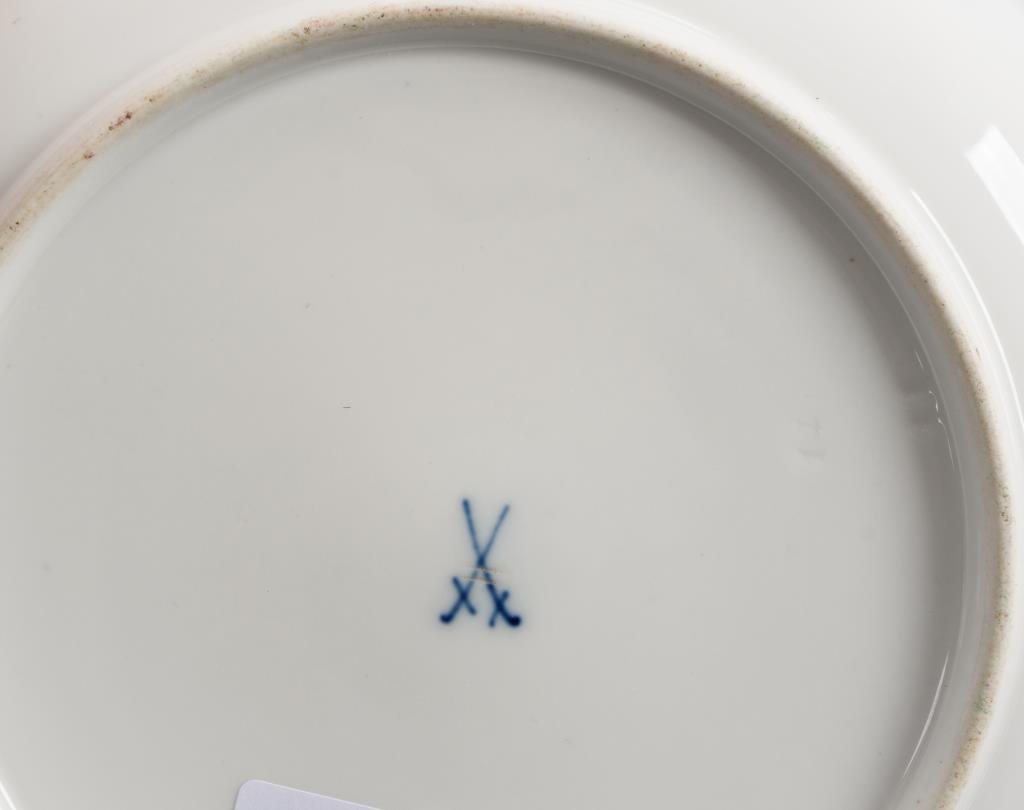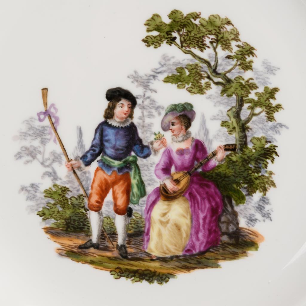 Speiseteller in der Form "Neuer Ausschnitt". Im Spiegel eine galante Szene, Goldspitzenbordüre. Fahne restauriert.