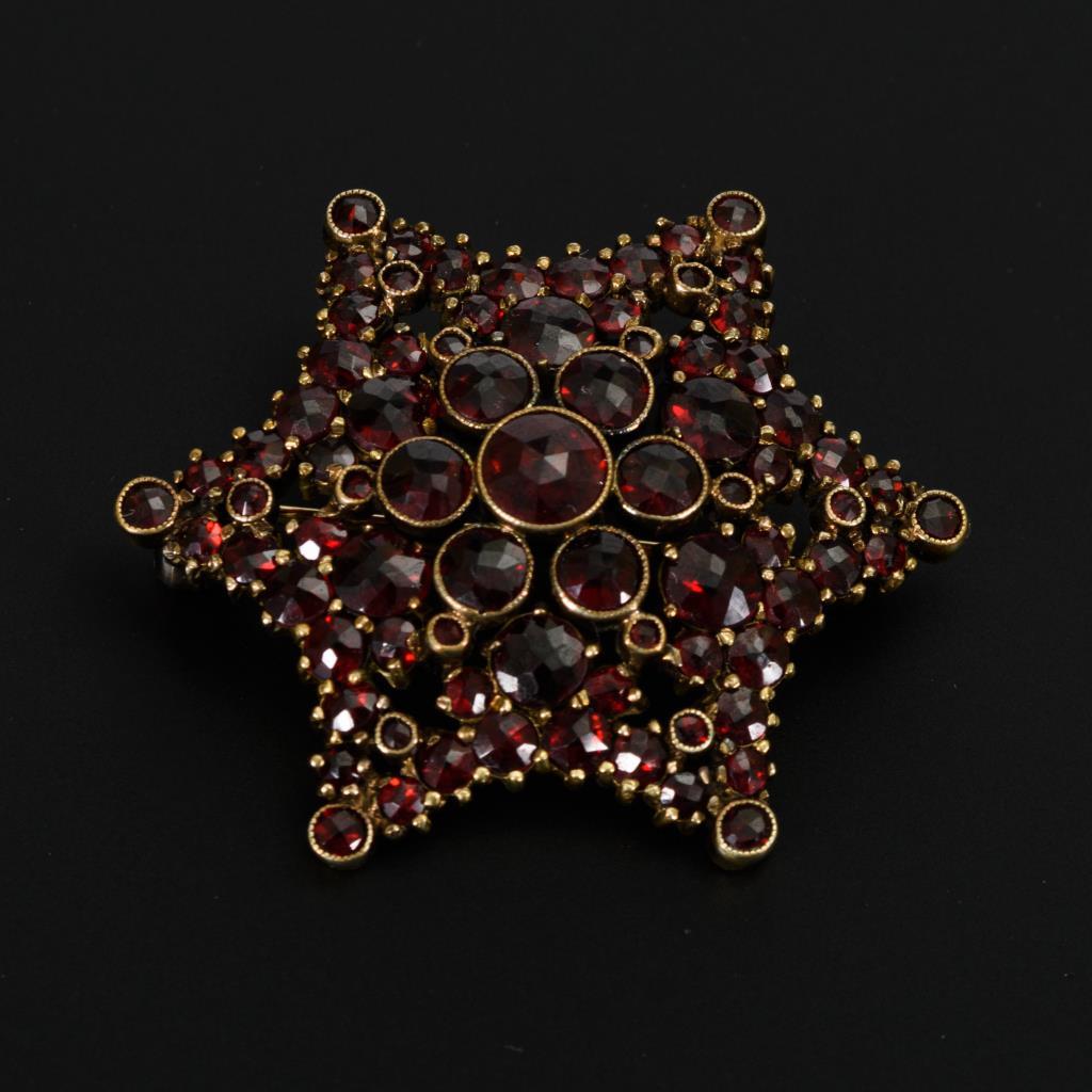 6-zackige Brosche mit Granatbesatz. Kugelhaken.