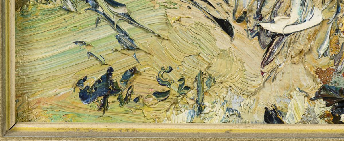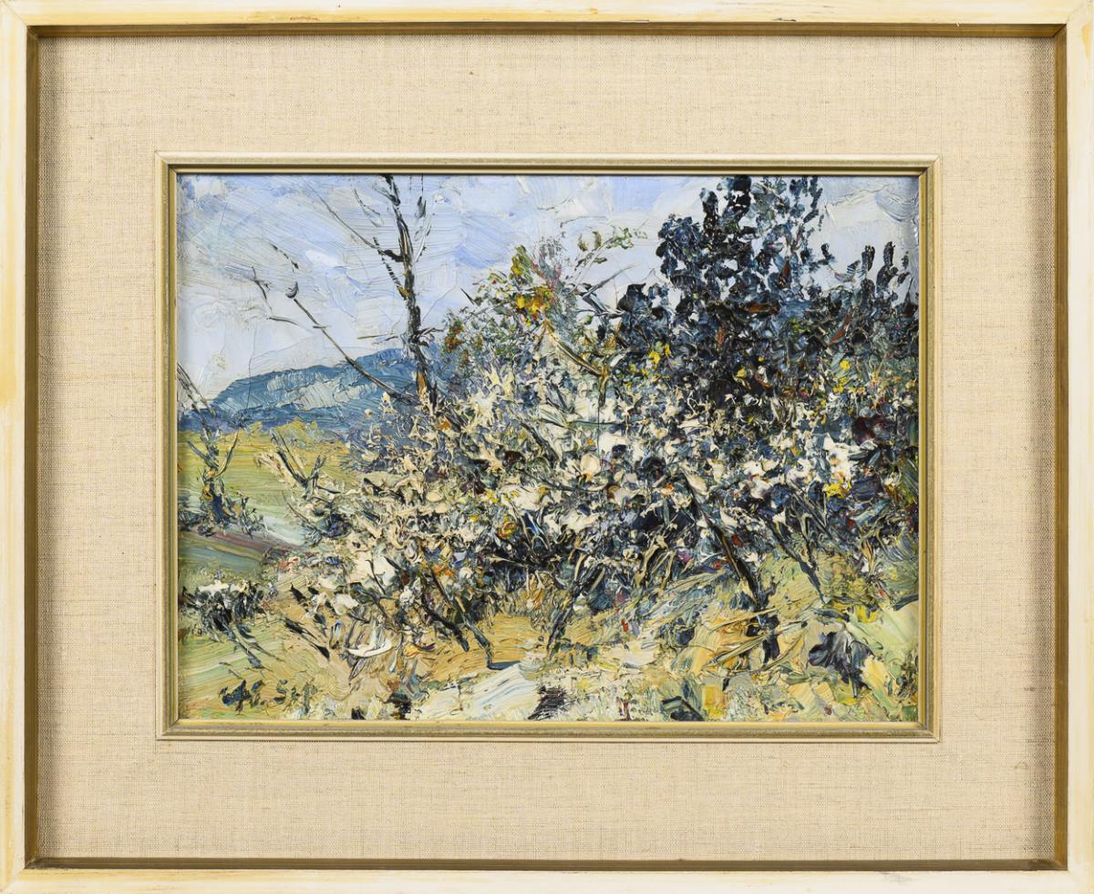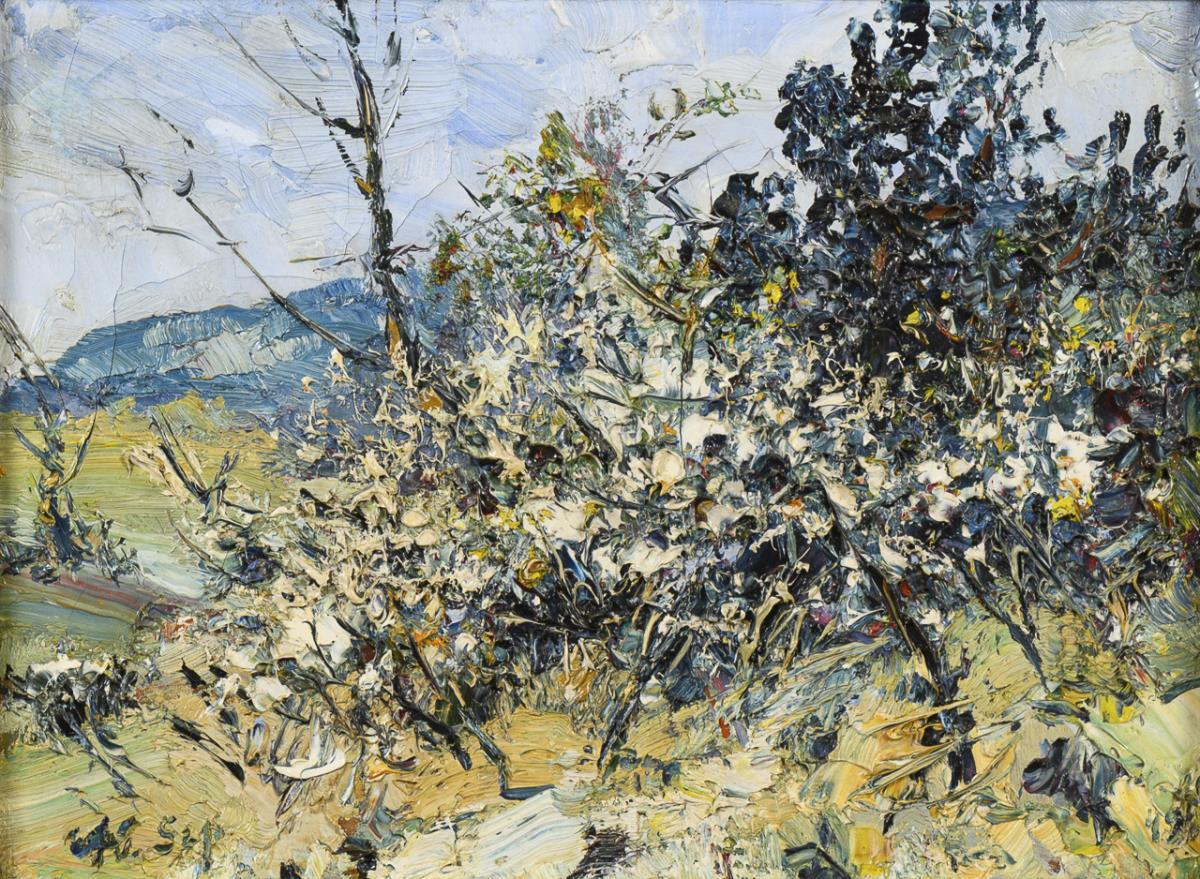 Exceedingly impasto with just shimmering colorfulness designed bushes in the foreground as well as view into the wide landscape. Stärker krakeliert.