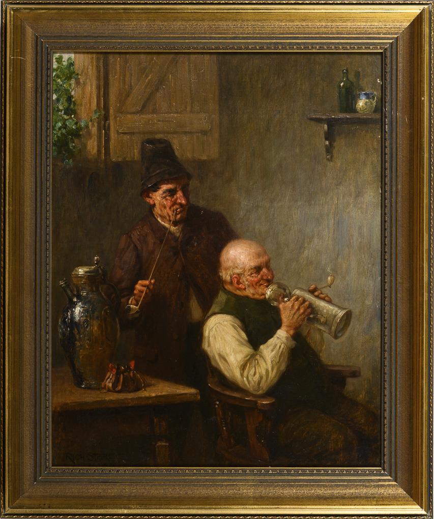 Two men with long-stemmed pipes and beer mugs in the tavern.