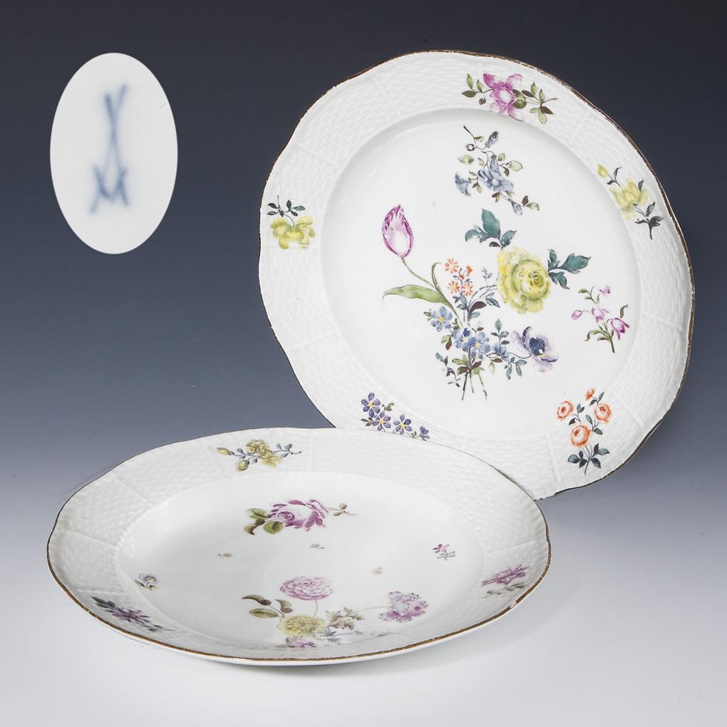 Relief decoration "Altozier". Model by Johann Joachim Kaendler and Johann Friedrich Eberlein 1735. Colored floral painting, capuchin brown painted rims. Press marks, sword marks. Partially rubbed, one edge minimally bumped.