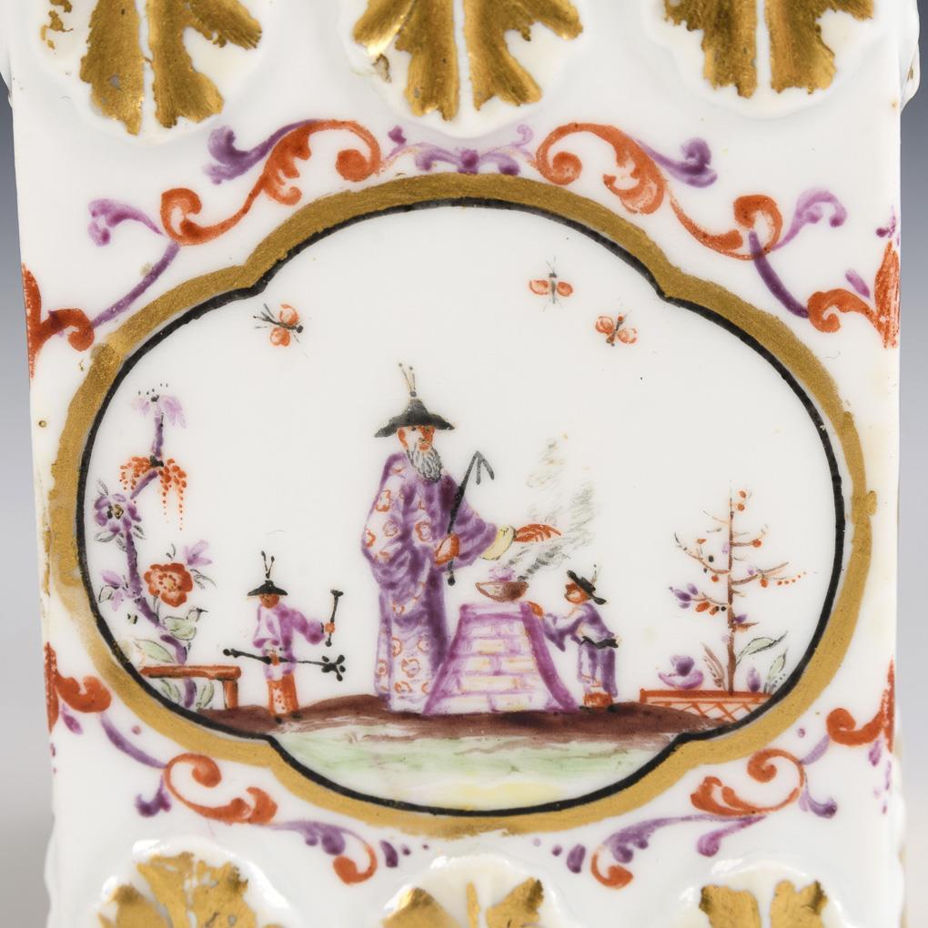 All sides fine colored painting with six different chinoiseries after Johann Gregorius Höroldt. Circumferential acanthus leaf borders in relief with gilded ribs. Gilded metal mount with hood lid. Unglazed bottom, maker's mark of Caspar Meißner senior (1689 Scharffenberg - 1751 Meissen), collaborator of Johann Friedrich Böttger. Sword mark |Supplement 19.06.22: partly minimal, not visible restorations at the corners. Gold partially rubbed.