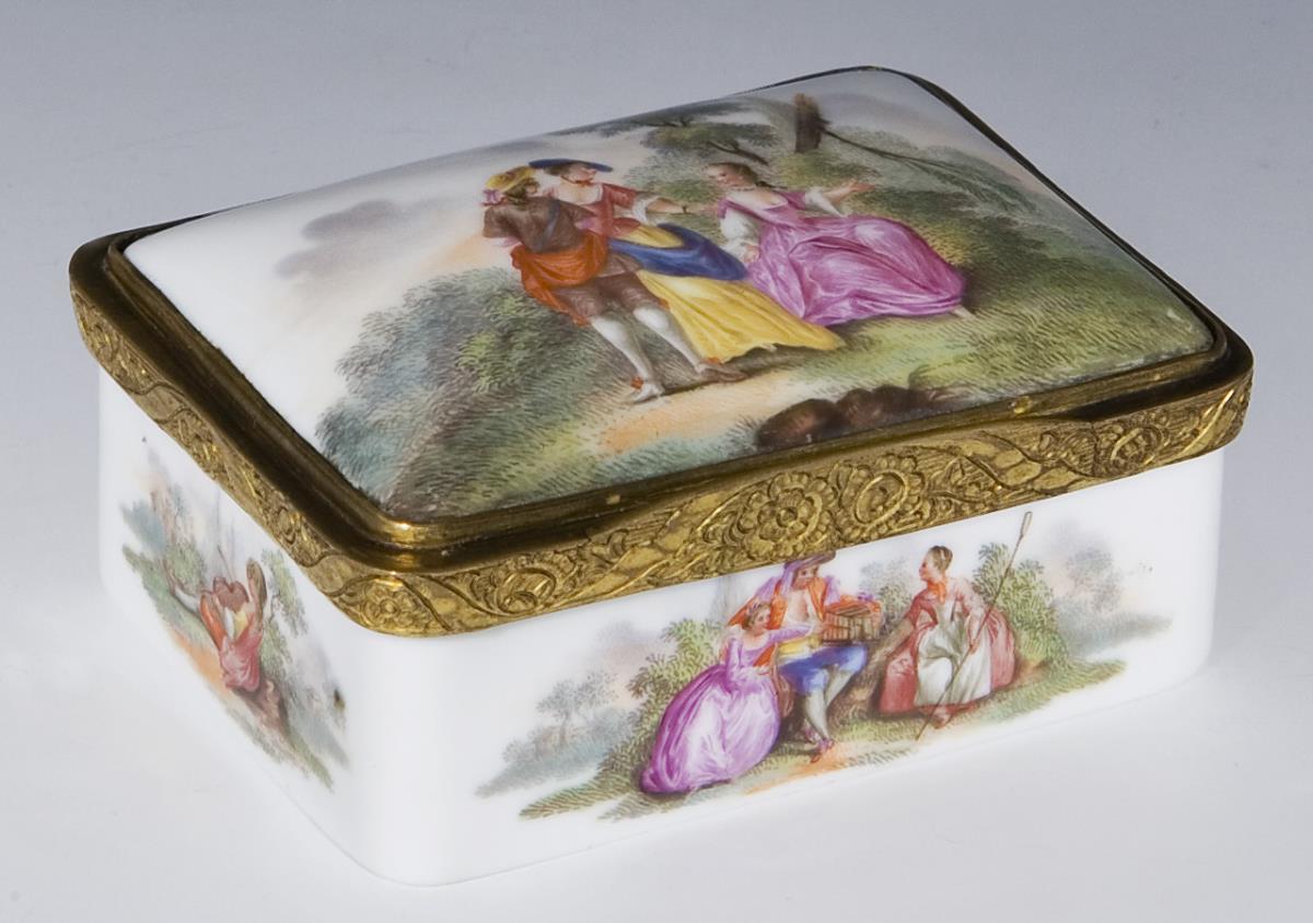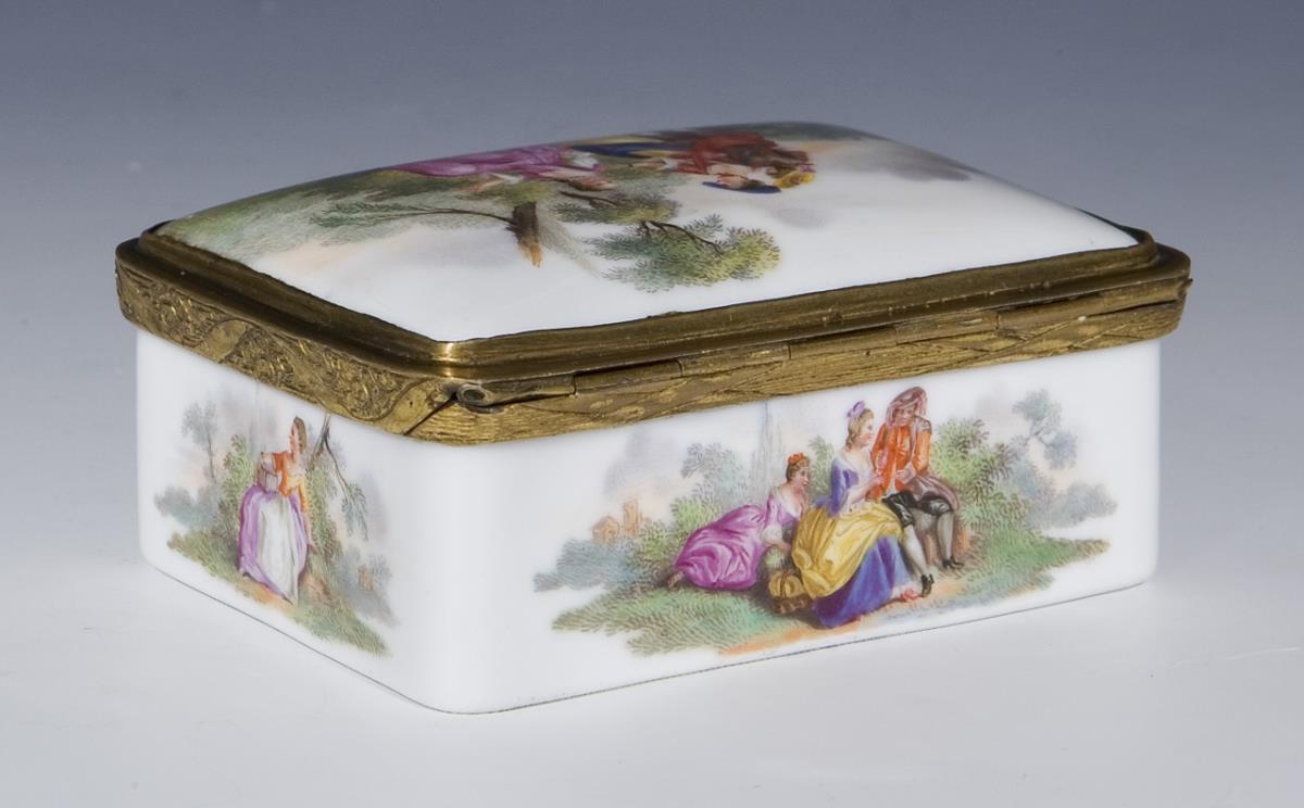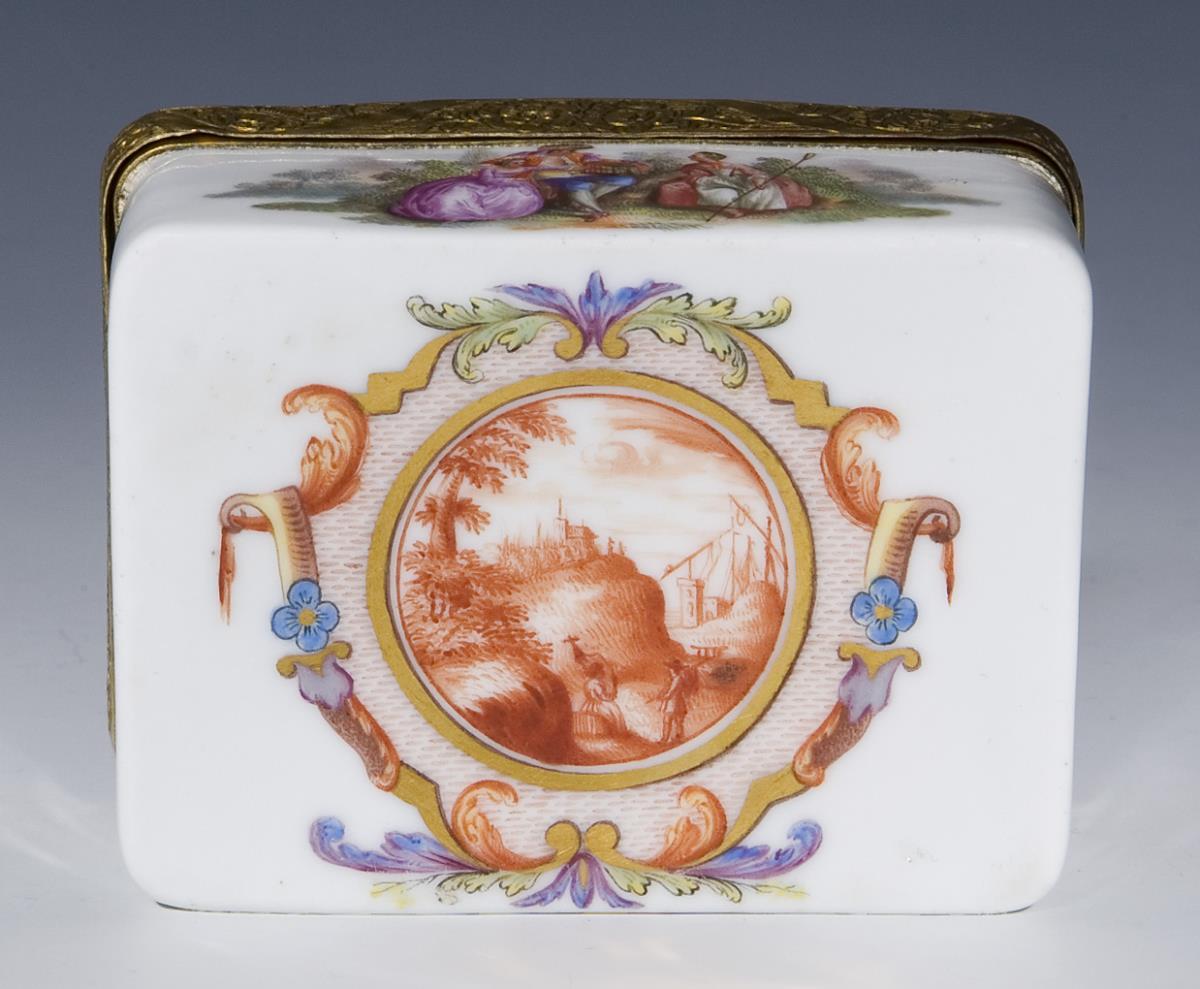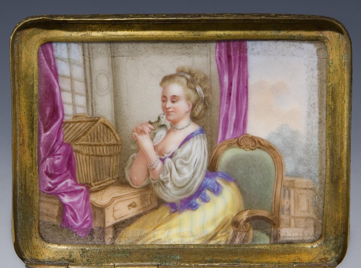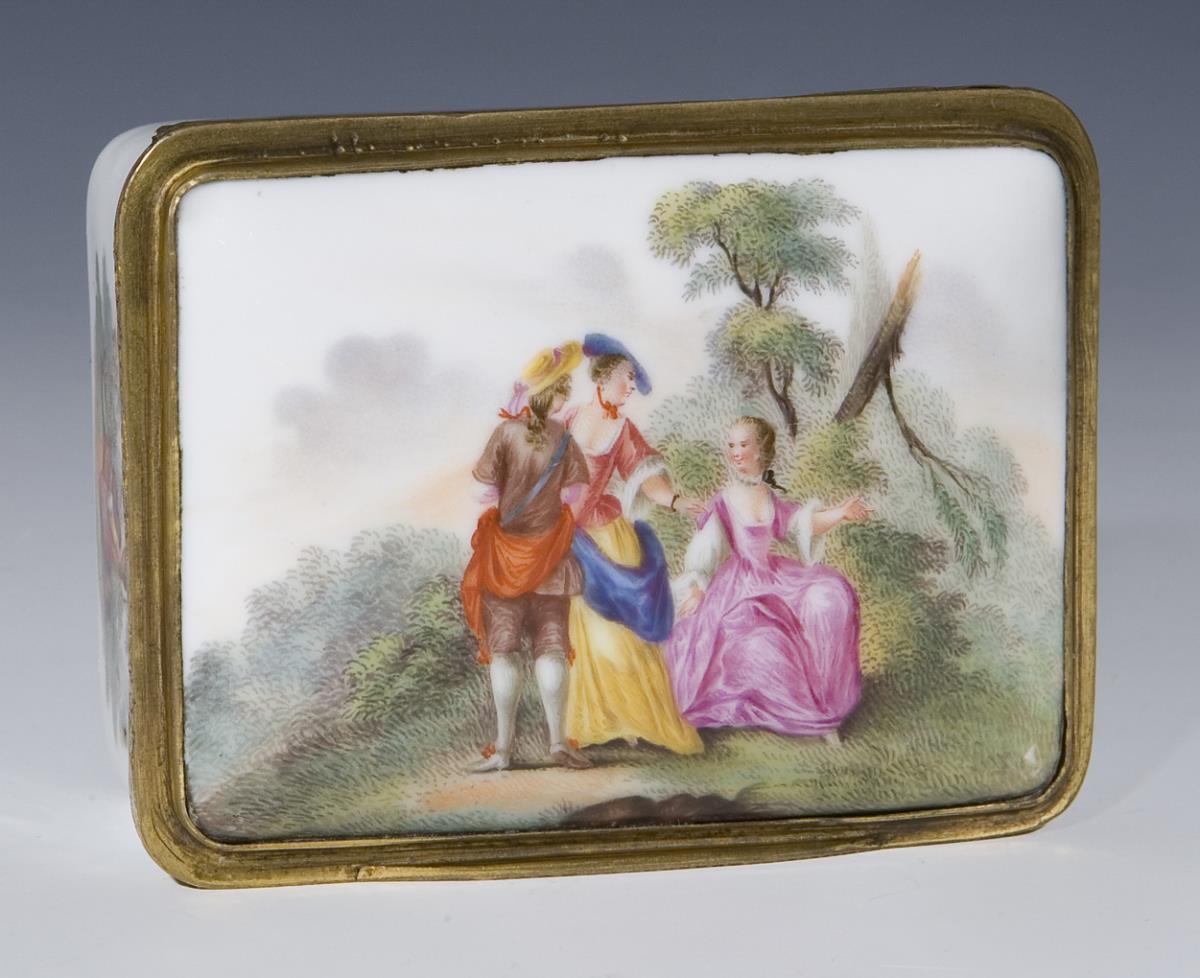 Fine colored painting all around and on the lid Watteau scenes, in the lid lady with birdcage, on the outer bottom round reserve with landscape in iron-red camaieumalerei, framed by an elaborate cartouche shaded in gold, inside gold background. Later mounting with hinge and thumb grip, without mark. Partial slight glaze defects.
